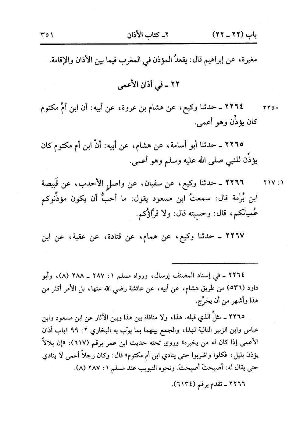 2264- حَدَّثَنَا وَكِيعٌ ، عَنْ هِشَامِ بْنِ عُرْوَةَ ، عَنْ أَبِيهِ : أَنَّ ابْنَ أُمِّ مَكْتُومٍ كَانَ يُؤَذِّنُ وَهُوَ أَعْمَى.