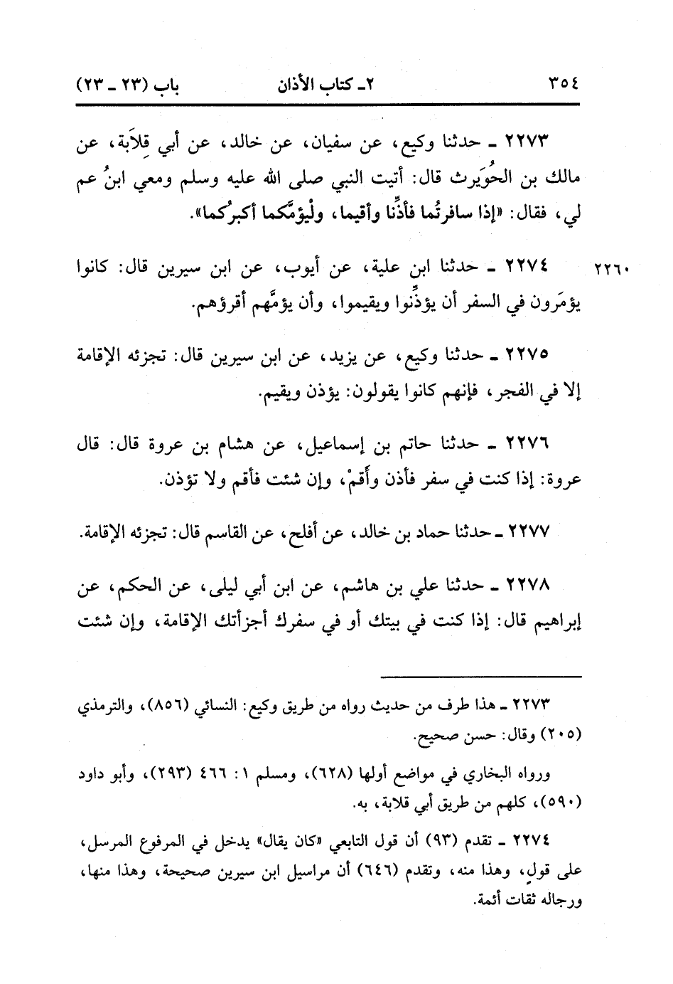 2273- حَدَّثَنَا وَكِيعٌ ، عَنْ سُفْيَانَ ، عَنْ خَالِدٍ ، عَنْ أَبِي قِلاَبَةَ ، عَنْ مَالِكِ بْنِ الْحُوَيْرِثِ ، قَالَ : أَتَيْتُ النَّبِيَّ صَلَّى اللَّهُ عَلَيْهِ وَسَلَّمَ وَمَعِي ابْنُ عَمٍّ لِي ، فَقَالَ : إِذَا سَافَرْتُمَا فَأَذِنَّا وَأَقِيمَا ، وَلْيَؤُمَّكُمَا أَكْبَرُكُمَا.