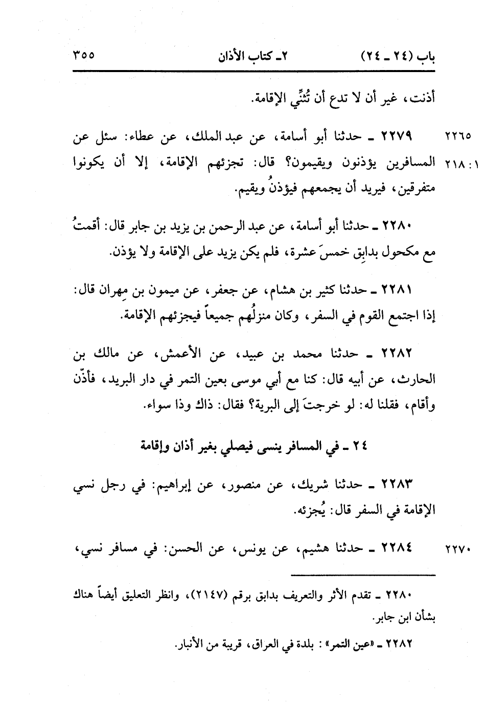 2282- حَدَّثَنَا مُحَمَّدُ بْنُ عُبَيْدٍ ، عَنِ الأَعْمَشِ ، عَنْ مَالِكِ بْنِ الْحَارِثِ ، عَنْ أَبِيهِ ، قَالَ : كُنَّا مَعَ أَبِي مُوسَى بِعَيْنِ التَّمْرِ فِي دَارِ الْبَرِيدِ ، فَأَذَّنَ وَأَقَامَ ، فَقُلْنَا لَهُ : لو خَرَجْتَ إِلَى الْبَرِّيَّةِ ؟فَقَالَ : ذَاكَ وَذَا سَوَاءٌ.
