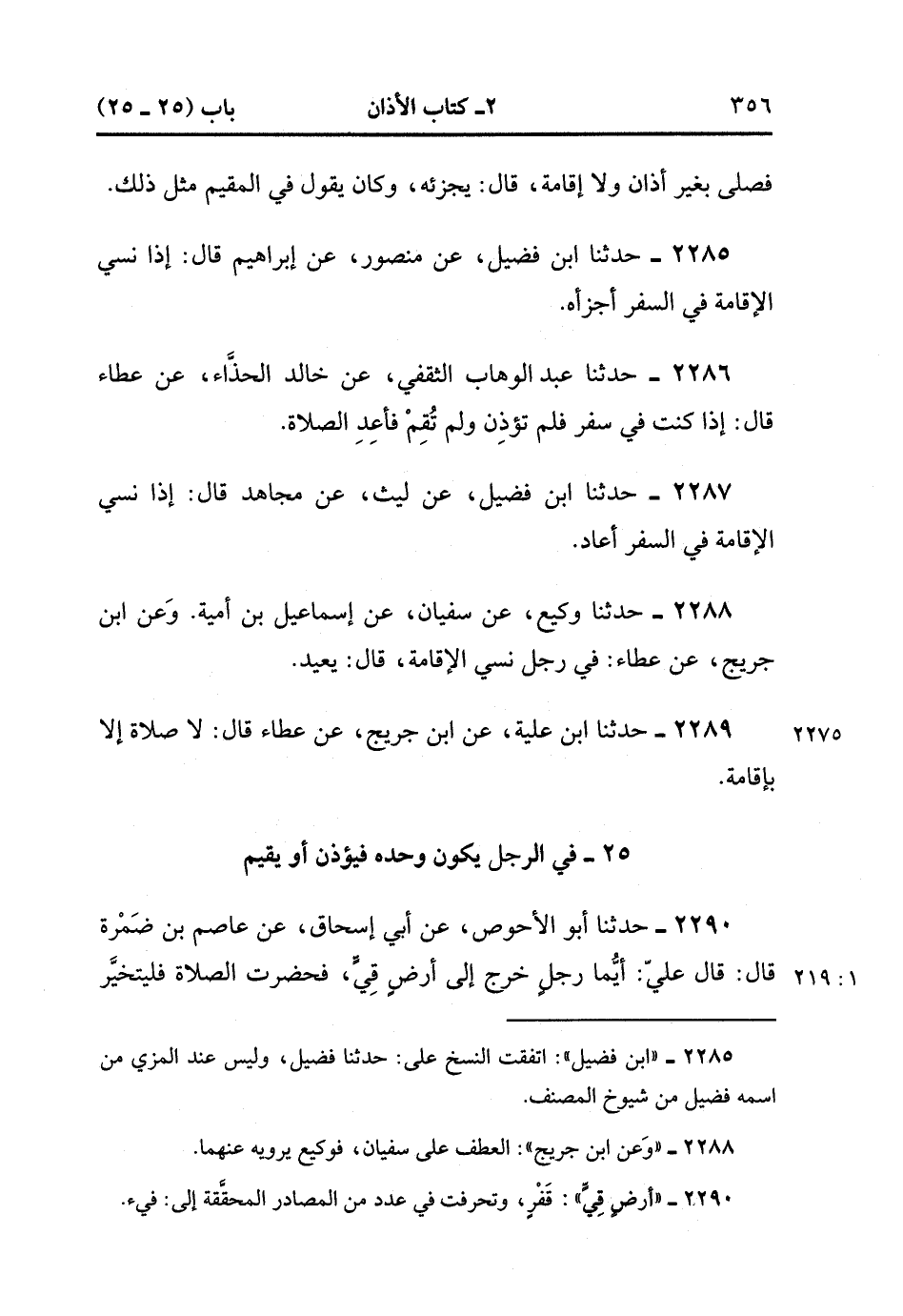 2290- حَدَّثَنَا أَبُو الأَحْوَصِِ ، عَنْ أَبِي إِسْحَاقَ ، عَنْ عَاصِمِ بْنِ ضَمْرَةَ ، قَالَ : قَالَ عَلِيٌّ : أَيُّمَا رَجُلٍ خَرَجَ إِلَى أَرْضِ قِيًّ ، فَحَضَرَتِ الصَّلاَةُ ، فَلْيَتَخَيَّرْ أَطْيَبَ الْبِقَاعِ وَأَنْظَفَهَا ، فَإِنَّ كُلَّ بُقْعَةٍ تُحِبُّ أَنْ يُذْكَرَ اللَّهُ فِيهَا ، فَإِنْ شَاءَ أَذَّنَ وَأَقَامَ ، وَإِنْ شَاءَ أَقَامَ إِقَامَةً وَاحِدَةً وَصَلَّى. (1/218).