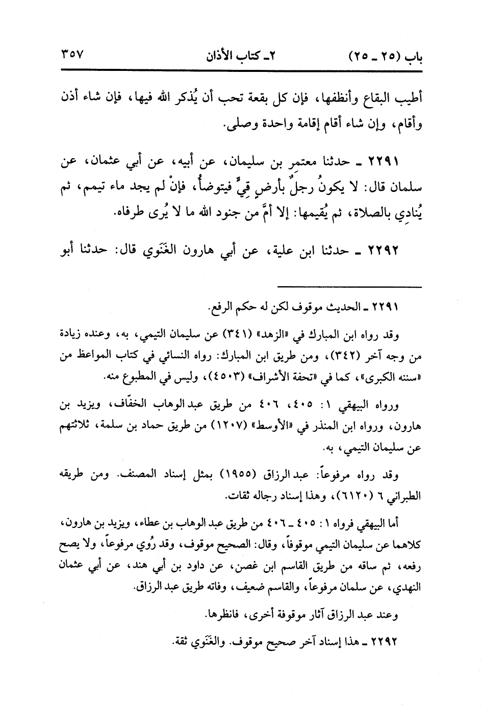 2292- حَدَّثَنَا ابْنُ عُلَيَّةَ ، عَنْ أَبِي هَارُونَ الْغَنَوِيِّ ، قَالَ : حَدَّثَنَا أَبُو عُثْمَانَ ، قَالَ : قَالَ سَلْمَانُ : مَا كَانَ رَجُلٍ فِي أَرْضِ قِيٍّ فَأَذَّنَ وَأَقَامَ ، إِلاَّ صَلَّى خَلْفَهُ مِنْ خَلْقِ اللهِ مَا لا يُرَى طَرَفَاهُ. (1/219).
