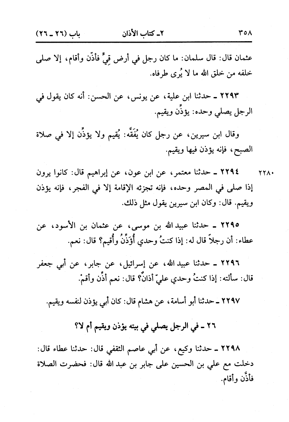 26- فِي الرَّجُلِ يُصَلِّي فِي بَيْتِهِ يُؤَذِّنُ وَيُقِيمُ أَمْ لا ؟