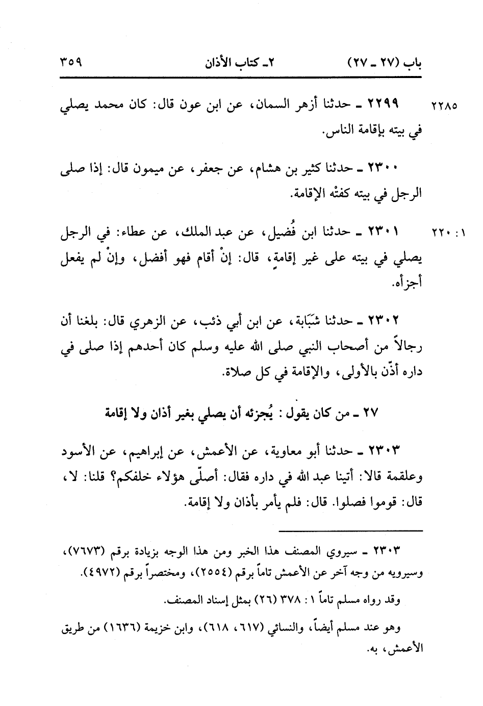 2303- حَدَّثَنَا أَبُو مُعَاوِيَةَ ، عَنِ الأَعْمَشِ ، عَنْ إبْرَاهِيمَ ، عَنِ الأَسْوَدِ وَعَلْقَمَةَ ، قَالاَ : أَتَيْنَا عَبْدَ اللهِ فِي دَارِهِ ، فَقَالَ : أَصَلَّى هَؤُلاَءِ خَلْفَكُمْ ؟ قُلْنَا : لا ، قَالَ : قُومُوا فَصَلُّوا ، فَلَمْ يَأْمُرْ بِأَذَانٍ وَلا إقَامَةٍ. (1/220).