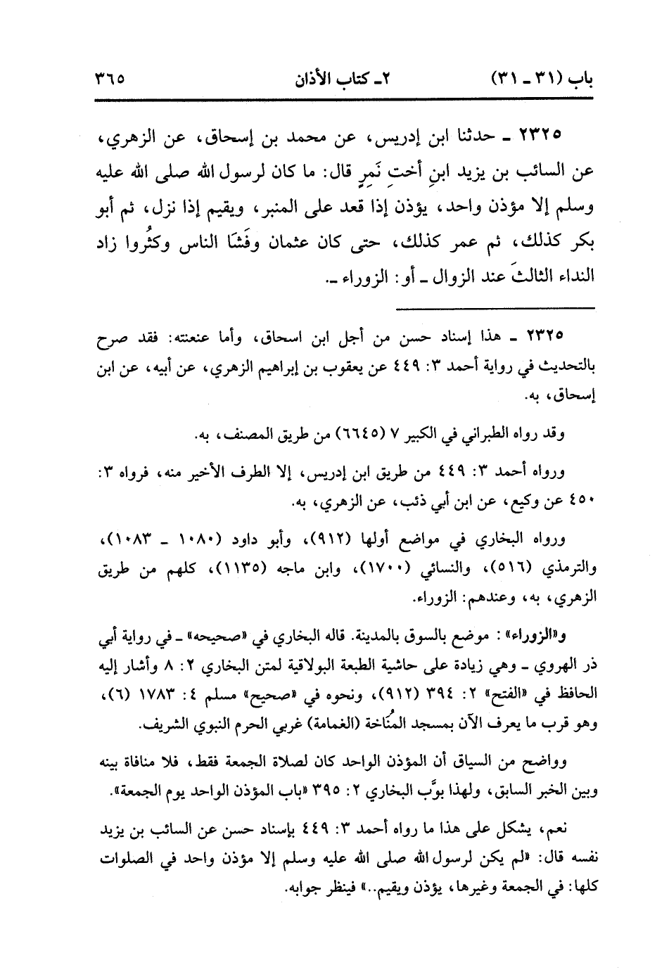 2325- حَدَّثَنَا ابْنُ إدْرِيسَ ، عَنْ مُحَمَّدِ بْنِ إِسْحَاقَ ، عَنِ الزُّهْرِيِّ ، عَنِ السَّائِبِ بْنِ يَزِيدَ ابْنِ أُخْتِ نَمِرٍ ، قَالَ : مَا كَانَ لِرَسُولِ اللهِ صَلَّى الله عَلَيْهِ وَسَلَّمَ إِلاَّ مُؤَذِّنٌ وَاحِدٌ يُؤَذِّنُ إذَا قَعَدَ عَلَى الْمِنْبَرِ وَيُقِيمُ إذَا نَزَلَ ، ثُمَّ أَبُو بَكْرٍ كَذَلِكَ ، ثُمَّ عُمَرُ كَذَلِكَ ، حَتَّى كَانَ عُثْمَانَ وَفَشَا النَّاسُ وَكَثُرُوا زَادَ النِّدَاءَ الثَّالِثَ عِنْدَ الزَّوَالِ أَوِ الزَّوْرَاءِ. (1/222).
