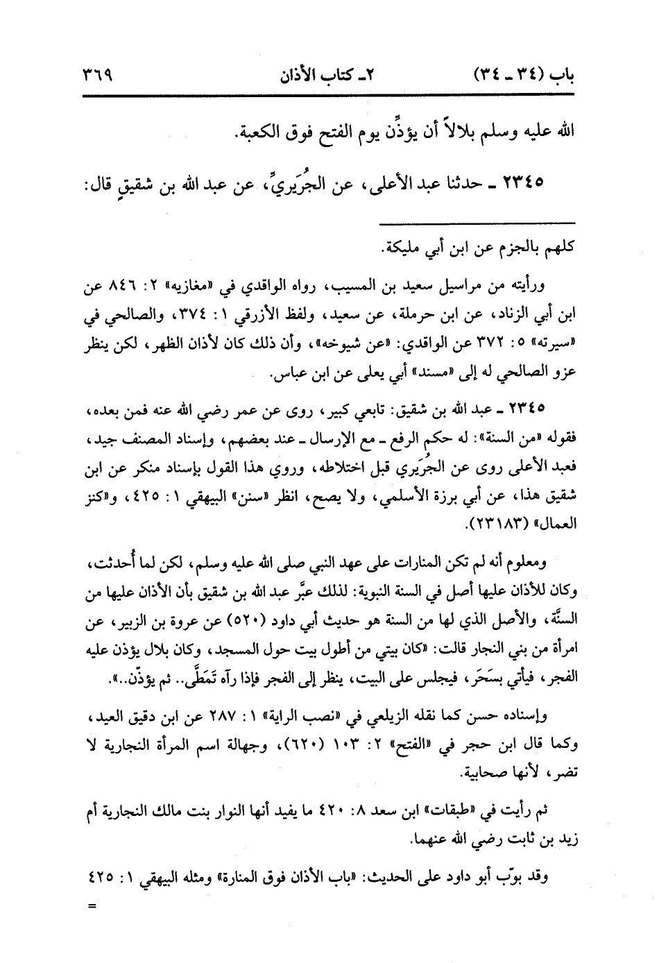 2345- حَدَّثَنَا عَبْدُ الأَعْلَى ، عَنِ الْجُرَيْرِيِّ ، عَنْ عَبْدِ اللهِ بْنِ شَقِيقٍ ، قَالَ : مِنَ السُّنَّةِ الأَذَانُ فِي الْمَنَارَةِ ، وَالإِقَامَةُ فِي الْمَسْجِدِ ، وَكَانَ عَبْدُ اللهِ يَفْعَلُهُ. (1/224).