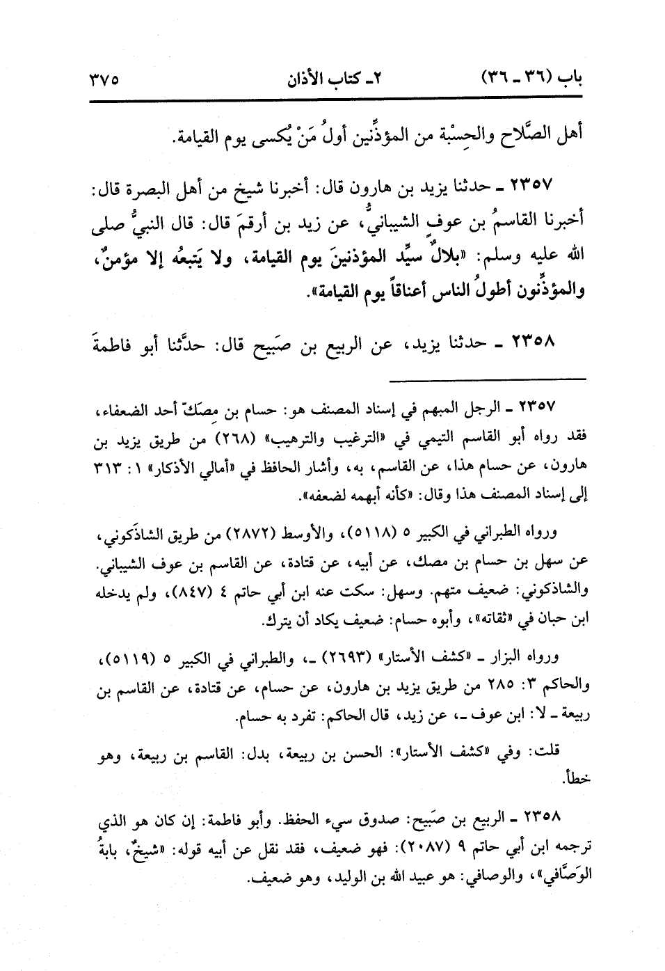 2357- حَدَّثَنَا يَزِيدُ بْنُ هَارُونَ , قَالَ : أَخْبَرَنَا شَيْخٌ مِنْ أَهْلِ الْبَصْرَةِ , قَالَ : أَخْبَرَنَا الْقَاسِمُ بْنُ عَوْفٍ الشَّيْبَانِيُّ ، عَنْ زَيْدِ بْنِ أَرْقَمَ ، قَالَ : قَالَ النَّبِيُّ صَلَّى الله عَلَيْهِ وَسَلَّمَ : بِلاَلٌ سَيِّدُ الْمُؤَذِّنِينَ يَوْمَ الْقِيَامَةِ ، وَلا يَتْبَعُهُ إِلاَّ مُؤْمِنٌ ، وَالْمُؤَذِّنُونَ أَطْوَلُ النَّاسِ أَعْنَاقًا يَوْمَ الْقِيَامَةِ.