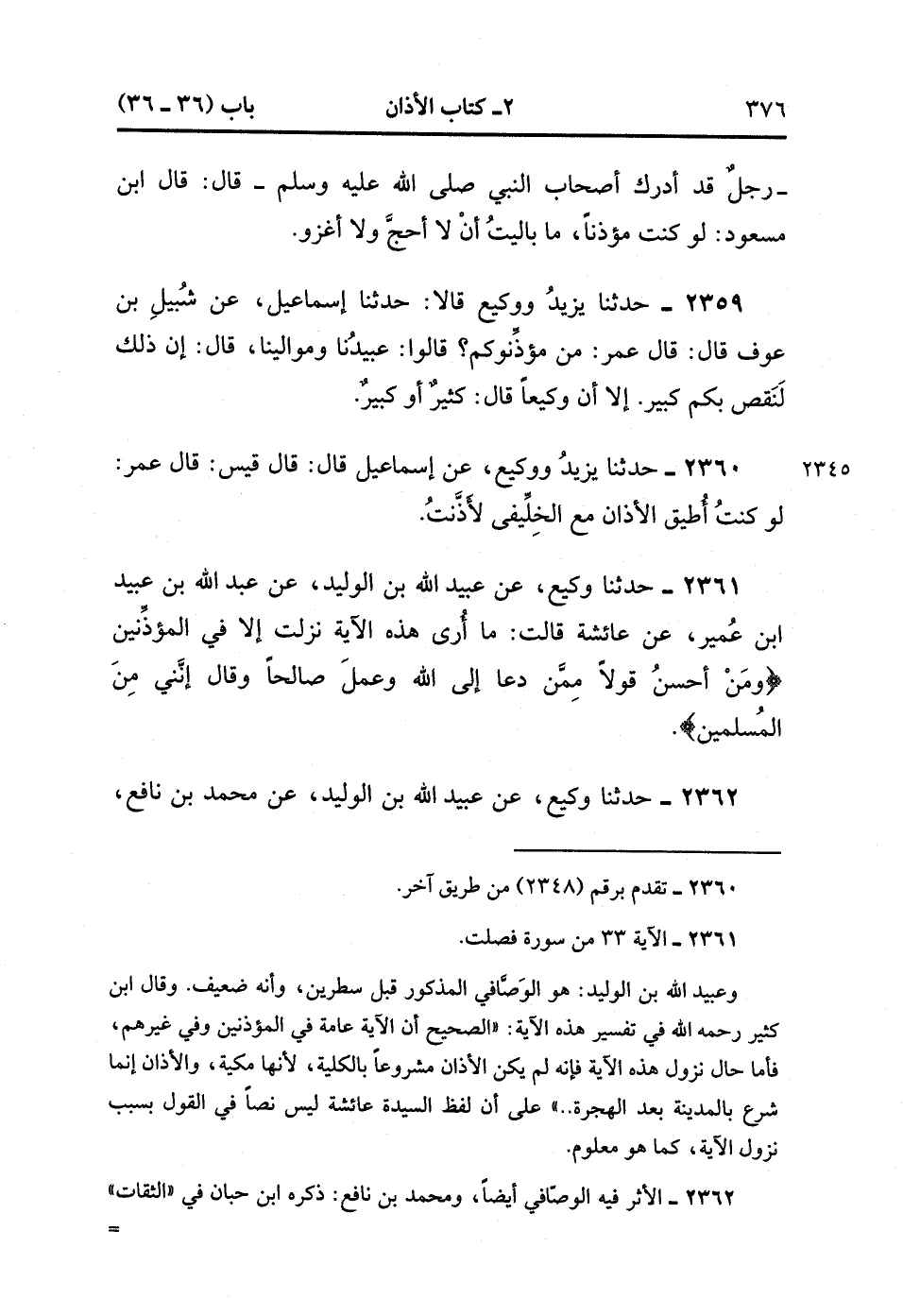 2361- حَدَّثَنَا وَكِيعٌ ، عَنْ عُبَيْدِ اللهِ بْنِ الْوَلِيدِ ، عَنْ عُبَدِ اللهِ بْنِ عُبَيْدِ بْنِ عُمَيْرٍ ، عَنْ عَائِشَةَ ، قَالَتْ : مَا أُرَى هَذِهِ الآيَةَ نَزَلَتْ إِلاَّ فِي الْمُؤَذِّنِينَ : {وَمَنْ أَحْسَنُ قَوْلاً مِمَّنْ دَعَا إلَى اللهِ وَعَمِلَ صَالِحًا وَقَالَ إنَّنِي مِنَ الْمُسْلِمِينَ}.