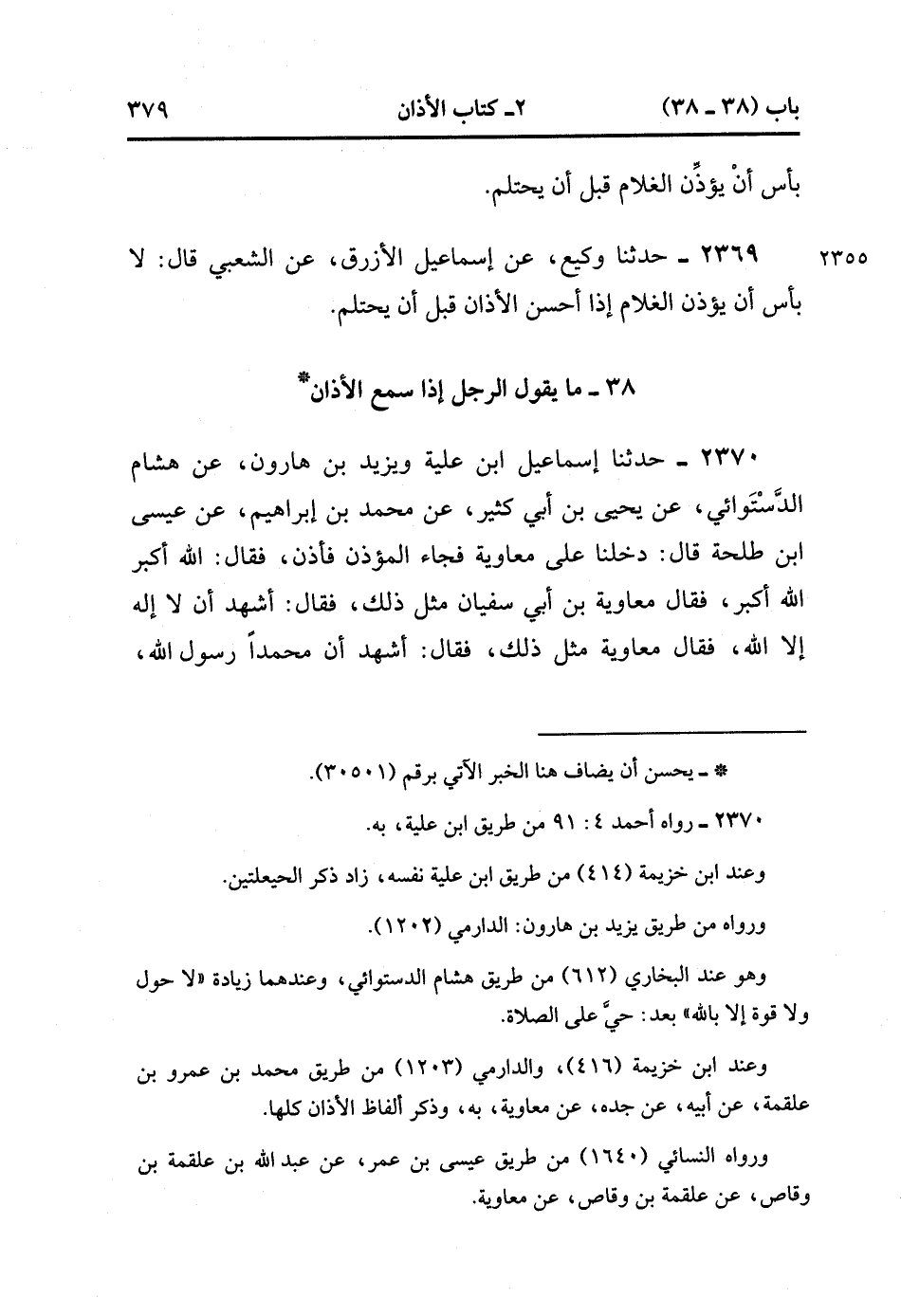 2370- حَدَّثَنَا إسْمَاعِيلُ ابْنُ عُلَيَّةَ وَيَزِيدُ بْنُ هَارُونَ ، عَنْ هِشَامٍ الدَّسْتُوَائِيِّ ، عَنْ يَحْيَى بْنِ أَبِي كَثِيرٍ ، عَنْ مُحَمَّدِ بْنِ إِبْرَاهِيمَ ، عَنْ عِيسَى بْنِ طَلْحَةَ ، قَالَ : دَخَلْنَا عَلَى مُعَاوِيَةَ فَجَاءَ الْمُؤَذِّنُ فَأَذَّنَ ، فَقَالَ : اللَّهُ أَكْبَرُ ، اللَّهُ أَكْبَرُ ، فَقَالَ مُعَاوِيَةُ بْنُ أَبِي سُفْيَانَ مِثْلَ ذَلِكَ ، فَقَالَ : أَشْهَدُ أَنْ لا إِلَهَ إِلاَّ اللَّهُ ، فَقَالَ مُعَاوِيَةُ مِثْلَ ذَلِكَ ، فَقَالَ : أَشْهَدُ أَنَّ مُحَمَّدًا رَسُولُ اللهِ ، فَقَالَ : مُعَاوِيَةُ مِثْلَ ذَلِكَ ، ثُمَّ قَالَ : هَكَذَا سَمِعْتُ نَبِيَّكُمْ صَلَّى الله عَلَيْهِ وَسَلَّمَ يَقُولُ. (1/226).