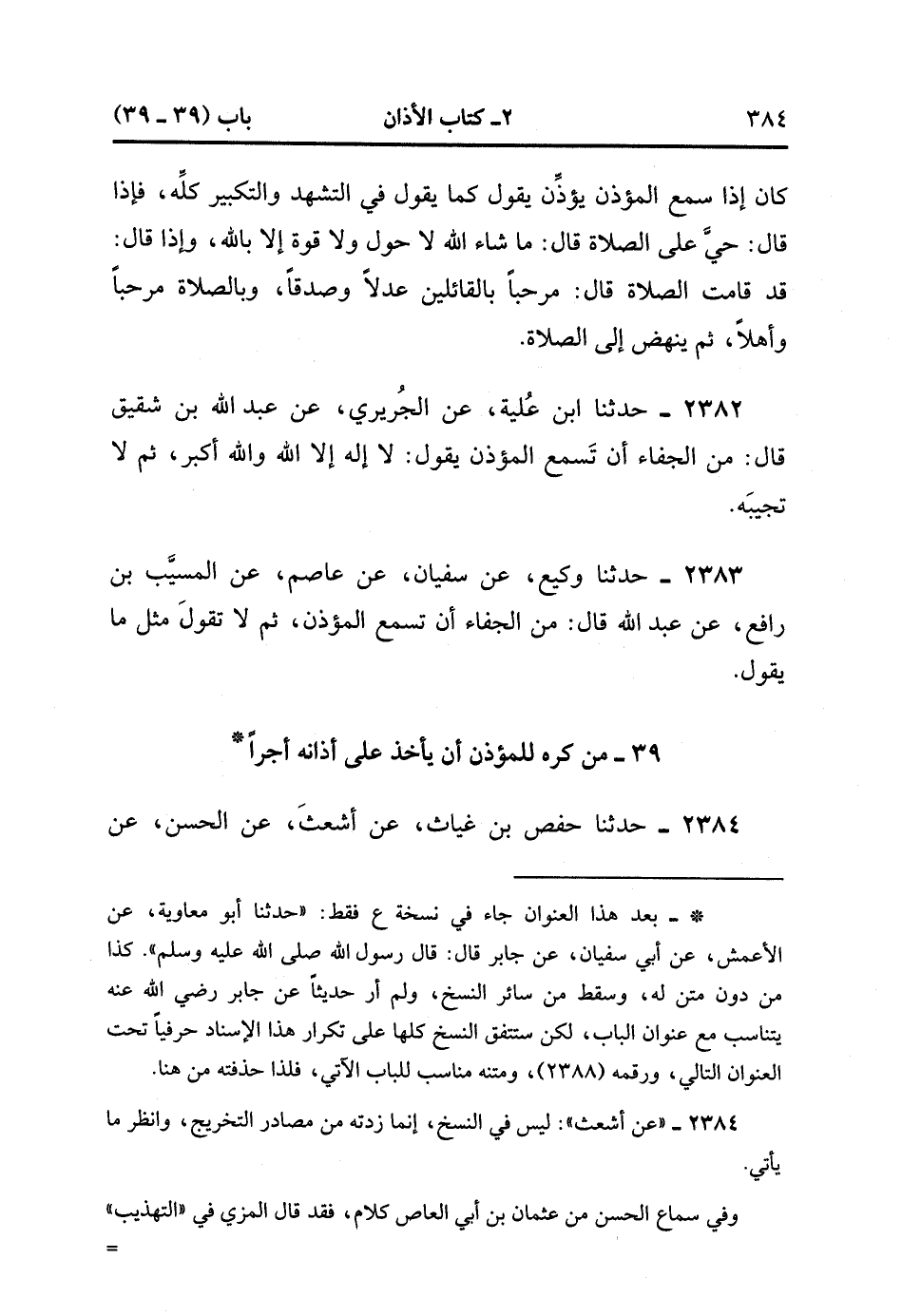 2383- حَدَّثَنَا وَكِيعٌ ، عَنْ سُفْيَانَ ، عَنْ عَاصِمٍ ، عَنِ الْمُسَيَّبِ بْنِ رَافِعٍ ، عَنْ عَبْدِ اللهِ ، قَالَ : مِنَ الْجَفَاءِ أَنْ تَسْمَعَ المؤذن ، ثُمَّ لا تَقُولُ مِثْلَ مَا يَقُولُ. (1/228).