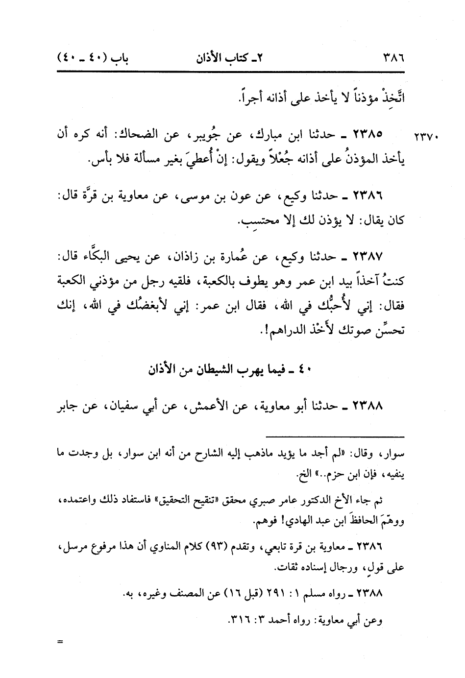2387- حَدَّثَنَا وَكِيعٌ ، عَنْ عُمَارَةَ بْنِ زَاذَانَ ، عَنْ يَحْيَى الْبَكَّاءِ ، قَالَ : كُنْتُ آخِذًا بِيَدِ ابْنِ عُمَرَ وَهُوَ يَطُوفُ بِالْكَعْبَةِ ، فَلَقِيَهُ رَجُلٌ مِنْ مُؤَذِّنِي الْكَعْبَةِ ، فَقَالَ : إنِّي لأُحِبُّك فِي اللهِ ، فَقَالَ ابْنُ عُمَرَ : إِنِّي لأبْغِضُك فِي اللهِ إنَّك تُحَسِّنُ صَوْتَكَ لأَخْذِ الدَّرَاهِمِ.