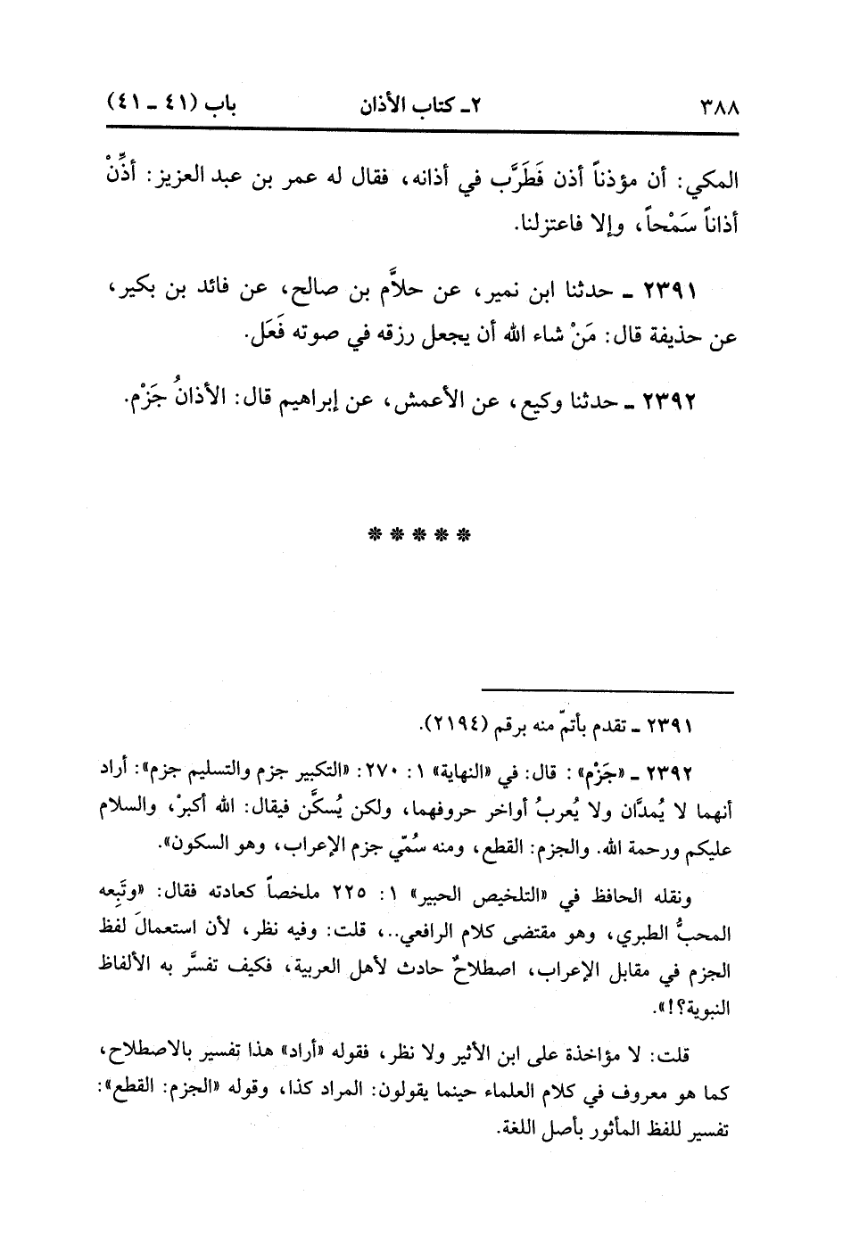 2392- حَدَّثَنَا وَكِيعٌ ، عَنِ الأَعْمَشِ ، عَنْ إبْرَاهِيمَ ، قَالَ : الأَذَانُ جَزْمٌ. (1/229).