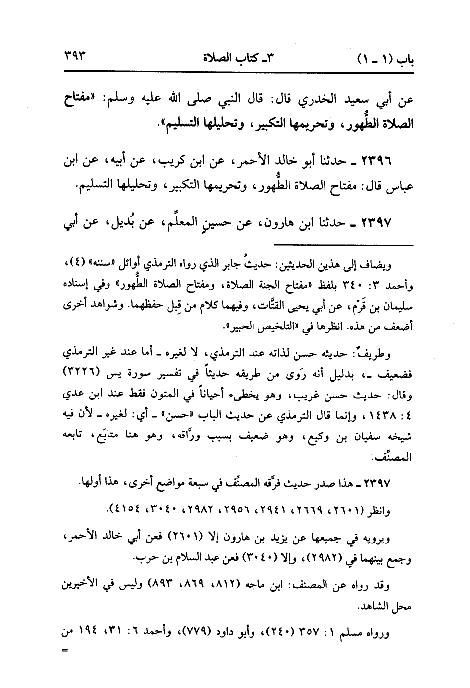2396- حَدَّثَنَا أَبُو خَالِدٍ الأَحْمَرِِِ ، عَنِ ابْنِ كُرَيْبٍ ، عَنْ أَبِيهِ ، عَنِ ابْنِ عَبَّاسٍ ، قَالَ : مِفْتَاحُ الصَّلاَةِ الطَّهُورُ ، وَتَحْرِيمُهَا التَّكْبِيرُ ، وَتَحْلِيلُهَا التَّسْلِيمُ.