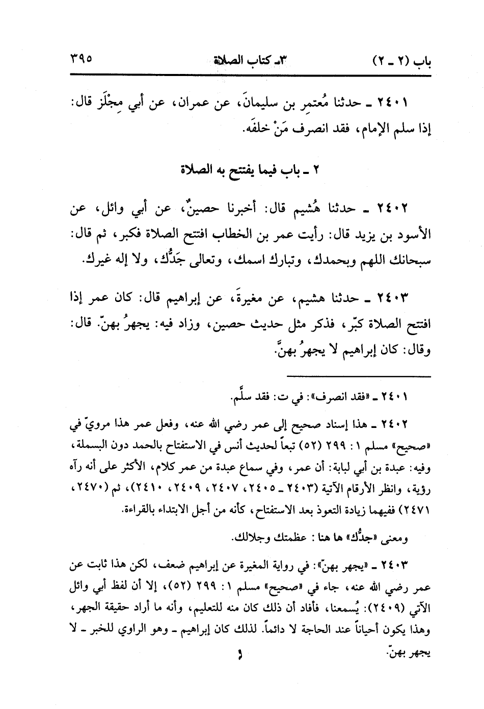 2402- حَدَّثَنَا هُشَيْمٌ ، قَالَ : أَخْبَرَنَا حُصَيْنٌ ، عَنْ أَبِي وَائِلٍ ، عَنِ الأَسْوَدِ بْنِ يَزِيدَ ، قَالَ : رَأَيْتُ عُمَرَ بْنَ الْخَطَّابِ افْتَتَحَ الصَّلاَةَ فَكَبَّرَ ، ثُمَّ قَالَ : سُبْحَانَك اللَّهُمَّ وَبِحَمْدِكَ وَتَبَارَكَ اسْمُك وَتَعَالَى جَدُّك وَلا إلَهَ غَيْرُك.