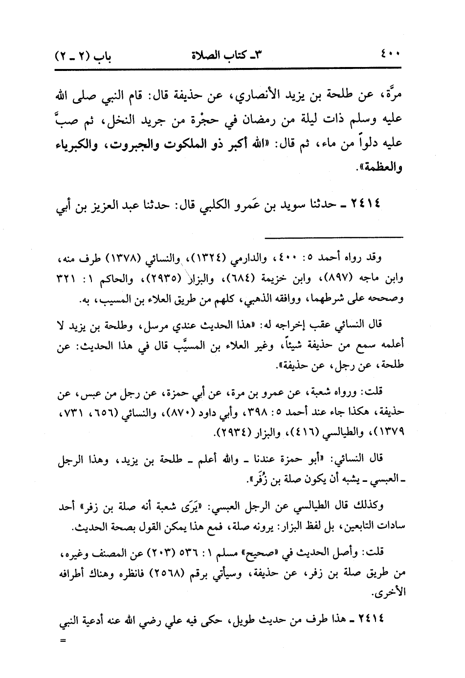 2413- حَدَّثَنَا ابْنُ فُضَيْلٍ ، عَنِ الْعَلاَءِ بْنِ الْمُسَيَّبِ ، عَنْ عَمْرو بْنِ مُرَّةَ ، عَنْ طَلْحَةَ بْنِ يَزِيدَ الأَنْصَارِيِّ ، عَنْ حُذَيْفَةَ قَالَ : قَامَ النَّبِيُّ صَلَّى الله عَلَيْهِ وَسَلَّمَ ذَاتَ لَيْلَةٍ مِنْ رَمَضَانَ فِي حُجْرَةٍ مِنْ جَرِيدِ النَّخْلِ ، ثُمَّ صَبَّ علَيْهِ دَلْوًا مِنْ مَاءٍ ، ثُمَّ قَالَ : اللَّهُ أَكْبَرُ ذُو الْمَلَكُوتِ وَالْجَبَرُوتِ ، وَالْكِبْرِيَاءِ وَالْعَظَمَةِ. (1/231).