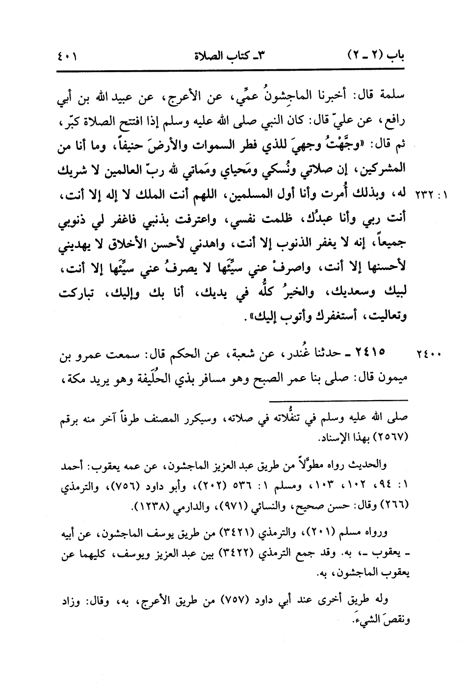 2414- حَدَّثَنَا سُوَيْد بْنُ عَمْرٍو الْكَلْبِيُّ ، قَالَ : حَدَّثَنَا عَبْدُ الْعَزِيزِ بْنُ أَبِي سَلَمَةَ , قَالَ : أَخْبَرَنَا الْمَاجِشُونُ عَمِّي ، عَنِ الأَعْرَجِ ، عَنْ عُبَيْدِ اللهِ بْنِ أَبِي رَافِعٍ ، عَنْ عَلِيٍّ ، قَالَ : كَانَ النَّبِيُّ صَلَّى الله عَلَيْهِ وَسَلَّمَ إذَا افْتَتَحَ الصَّلاَةَ كَبَّرَ ، ثُمَّ قَالَ : وَجَّهْت وَجْهِي لِلَّذِي فَطَرَ السَّمَاوَاتِ وَالأَرْضَ حَنِيفًا وَمَا أَنَا مِنَ الْمُشْرِكِينَ ، إنَّ صَلاَتِي وَنُسُكِي وَمَحْيَايَ وَمَمَاتِي لِلَّهِ رَبِّ الْعَالَمِينَ لا شَرِيكَ لَهُ وَبِذَلِكَ أُمِرْت وَأَنَا أَوَّلُ الْمُسْلِمِينَ ، اللَّهُمَّ أَنْتَ الْمَلِكُ لا إلَهَ إِلاَّ أَنْتَ ، أَنْتَ رَبِّي وَأَنَا عَبْدُك ، ظَلَمْت نَفْسِي وَاعْتَرَفْت بِذَنْبِي فَاغْفِرْ لِي ذُنُوبِي جَمِيعًا ، إِنَّهُ لا يَغْفِرُ الذُّنُوبَ إِلاَّ أَنْتَ ، وَاهْدِنِي لأَحْسَنِ الأَخْلاَقِ لا يَهْدِيني لأَحْسَنِهَا إِلاَّ أَنْتَ ، وَاصْرِفْ عَنِّي سَيِّئَهَا لا يَصْرِفُ عَنِّي سَيِّئَهَا إِلاَّ أَنْتَ ، لَبَّيْكَ وَسَعْدَيْكَ ، وَالْخَيْرُ كُلُّهُ فِي يَدَيْك ، أَنَا بِكَ وَإِلَيْك ، تَبَارَكْت وَتَعَالَيْت ، أَسْتَغْفِرُك وَأَتُوبُ إلَيْك. (1/231).