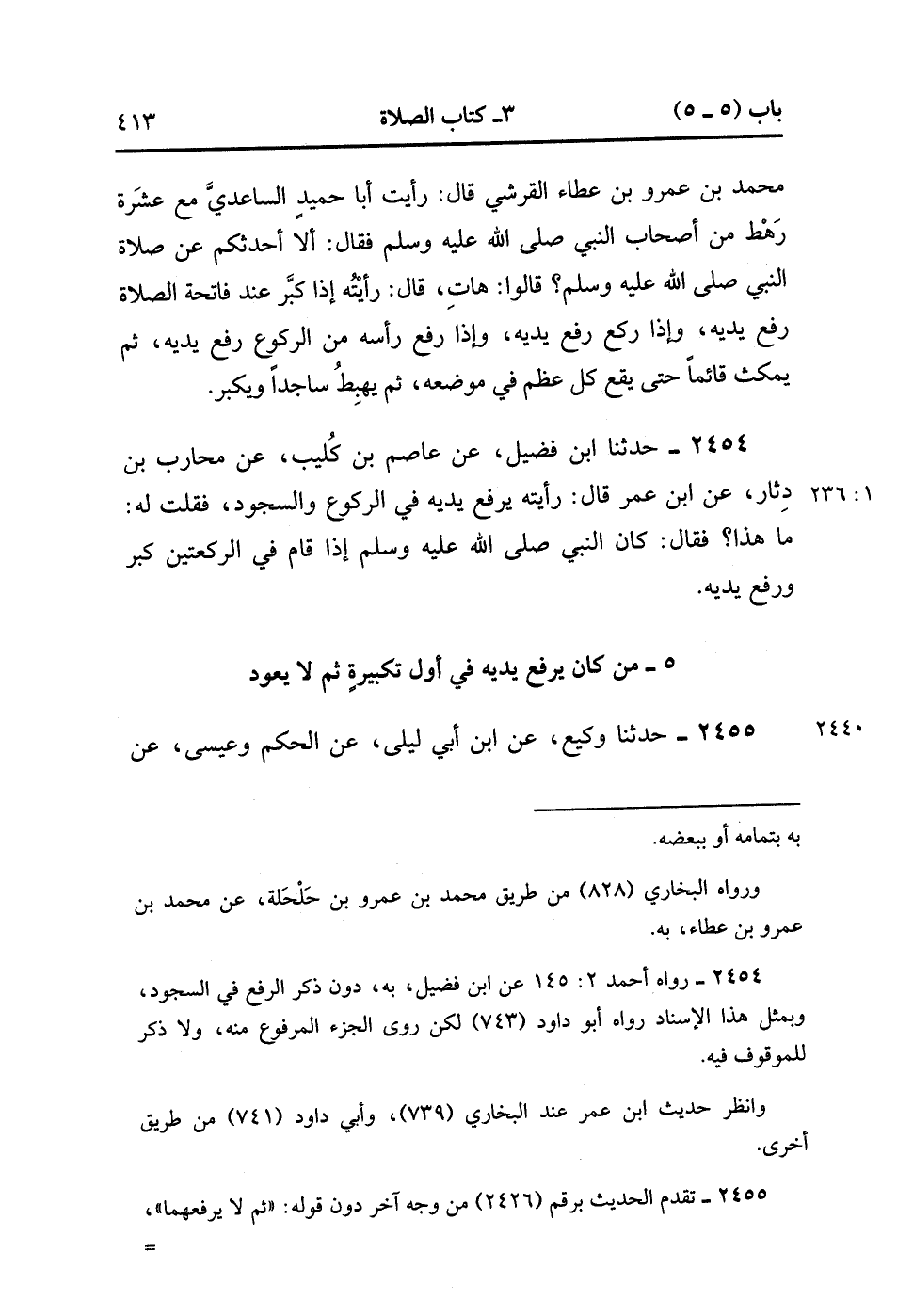 2454- حَدَّثَنَا ابْنُ فُضَيْلٍ ، عَنْ عَاصِمِ بْنِ كُلَيْبٍ ، عَنْ مُحَارِبِ بْنِ دِثَارٍ ، عَنِ ابْنِ عُمَرَ ، قَالَ : رَأَيْتُه يَرْفَعُ يَدَيْهِ فِي الرُّكُوعِ وَالسُّجُودِ ، فَقُلْتُ لَهُ : مَا هَذَا ؟ فَقَالَ : كَانَ النَّبِيُّ صَلَّى الله عَلَيْهِ وَسَلَّمَ إذَا قَامَ في الرَّكْعَتَيْنِ كَبَّرَ وَرَفَعَ يَدَيْهِ. (1/235).