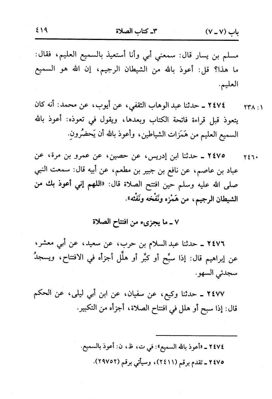 2474- حَدَّثَنَا عَبْدُ الْوَهَّابِ الثَّقَفِيُّ ، عَنْ أَيُّوبَ ، عَنْ مُحَمَّدٍ ؛ أَنَّهُ كَانَ يَتَعَوَّذُ قَبْلَ قِرَاءَةِ فَاتِحَةِ الْكِتَابِ وَبَعْدَهَا ، وَيَقُولُ فِي تَعَوُّذِهِ : أَعُوذُ بِاللَّهِ السَّمِيعِ الْعَلِيمِ مِنْ هَمَزَاتِ الشَّيَاطِينِ ، وَأَعُوذُ بِاللَّهِ أَنْ يَحْضُرُونِ. (1/237)