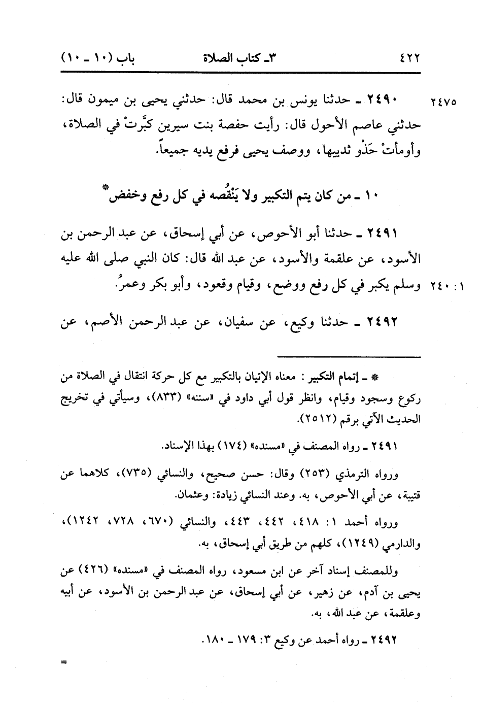 2491- حَدَّثَنَا أَبُو الأَحْوَصِِ ، عَنْ أَبِي إِسْحَاقَ ، عَنْ عَبْدِ الرَّحْمَنِ بْنِ الأَسْوَدِ ، عَنْ عَلْقَمَةَ وَالأَسْوَدِ ، عَنْ عَبْدِ اللهِ ، قَالَ : كَانَ النَّبِيُّ صَلَّى الله عَلَيْهِ وَسَلَّمَ يُكَبِّرُ فِي كُلِّ رَفْعٍ وَوَضْعٍ وَقِيَامٍ وَقُعُودٍ ، وَأَبُو بَكْرٍ وَعُمَرُ. (1/239)