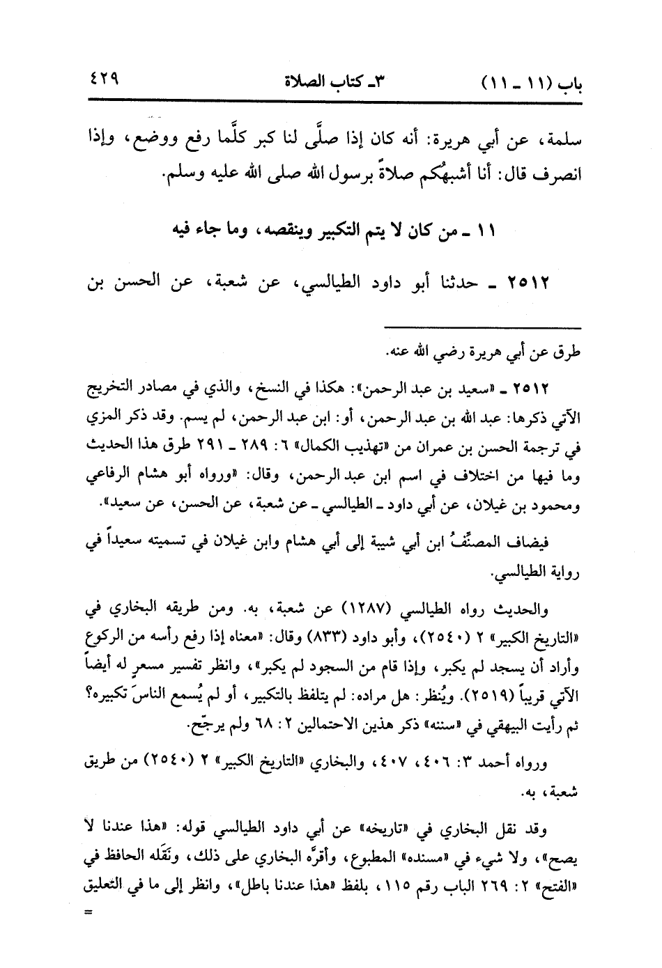 2512- حَدَّثَنَا أَبُو دَاوُدَ الطَّيَالِسِيُّ ، عَنْ شُعْبَةَ ، عَنِ الْحَسَنِ بْنِ عِمْرَانَ ، عَنْ سَعِيدِ بْنِ عَبْدِ الرَّحْمَنِ بْنِ أَبْزَى ، عَنْ أَبِيهِ ، قَالَ : صَلَّيْت خَلْفَ النَّبِيِّ صَلَّى الله عَلَيْهِ وَسَلَّمَ فَكَانَ لا يُتِمُّ التَّكْبِيرَ. (1/241).