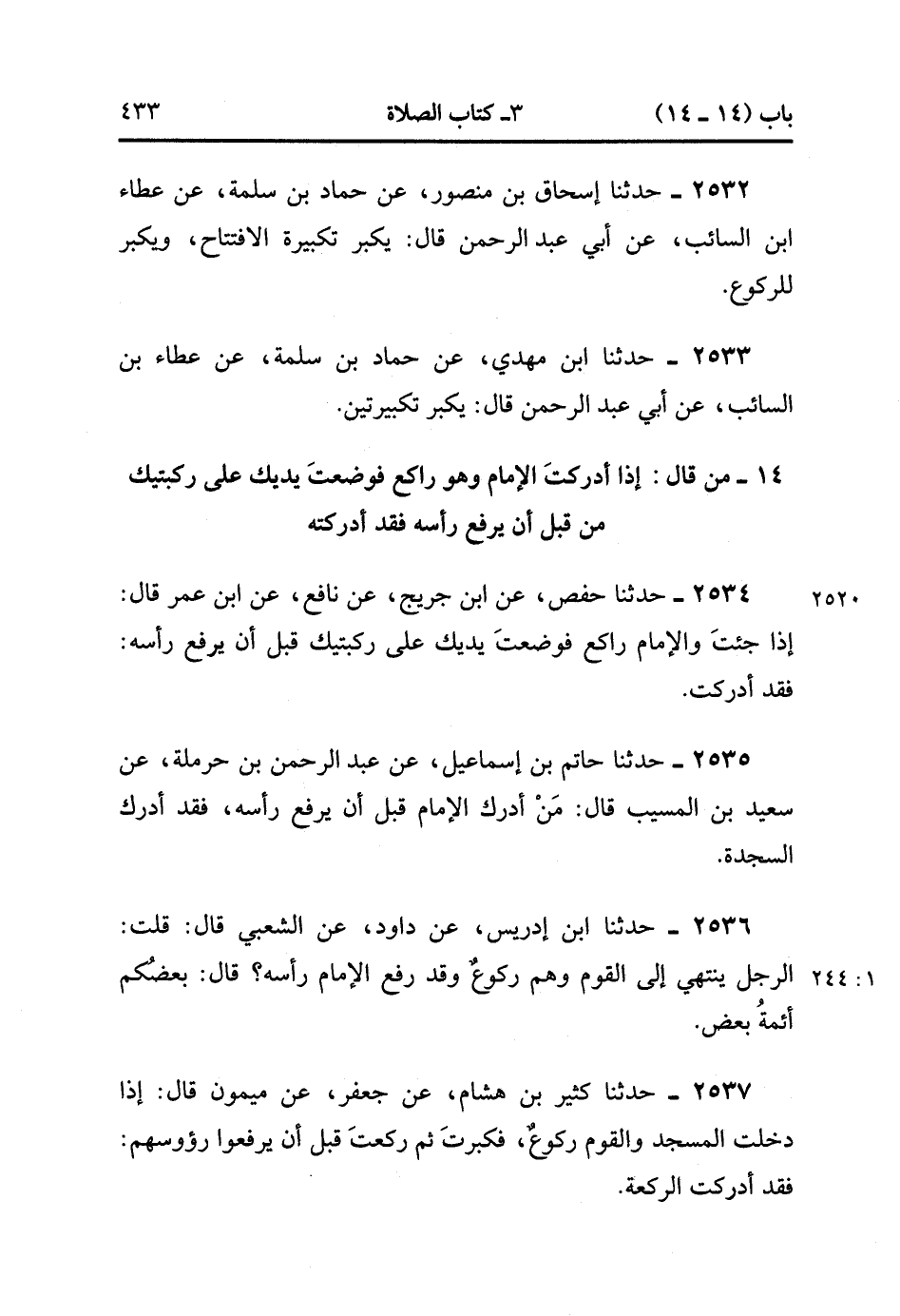 2537- حَدَّثَنَا كَثِيرُ بْنُ هِشَامٍ ، عَنْ جَعْفَرٍ ، عَنْ مَيْمُونٍ ، قَالَ : إذَا دَخَلْت الْمَسْجِدَ وَالْقَوْمُ رُكُوعٌ ، فَكَبَّرْتَ ثُمَّ رَكَعْتَ قَبْلَ أَنْ يَرْفَعُوا رُؤُوسَهُمْ فَقَدْ أَدْرَكْت الرَّكْعَةَ. (1/244).