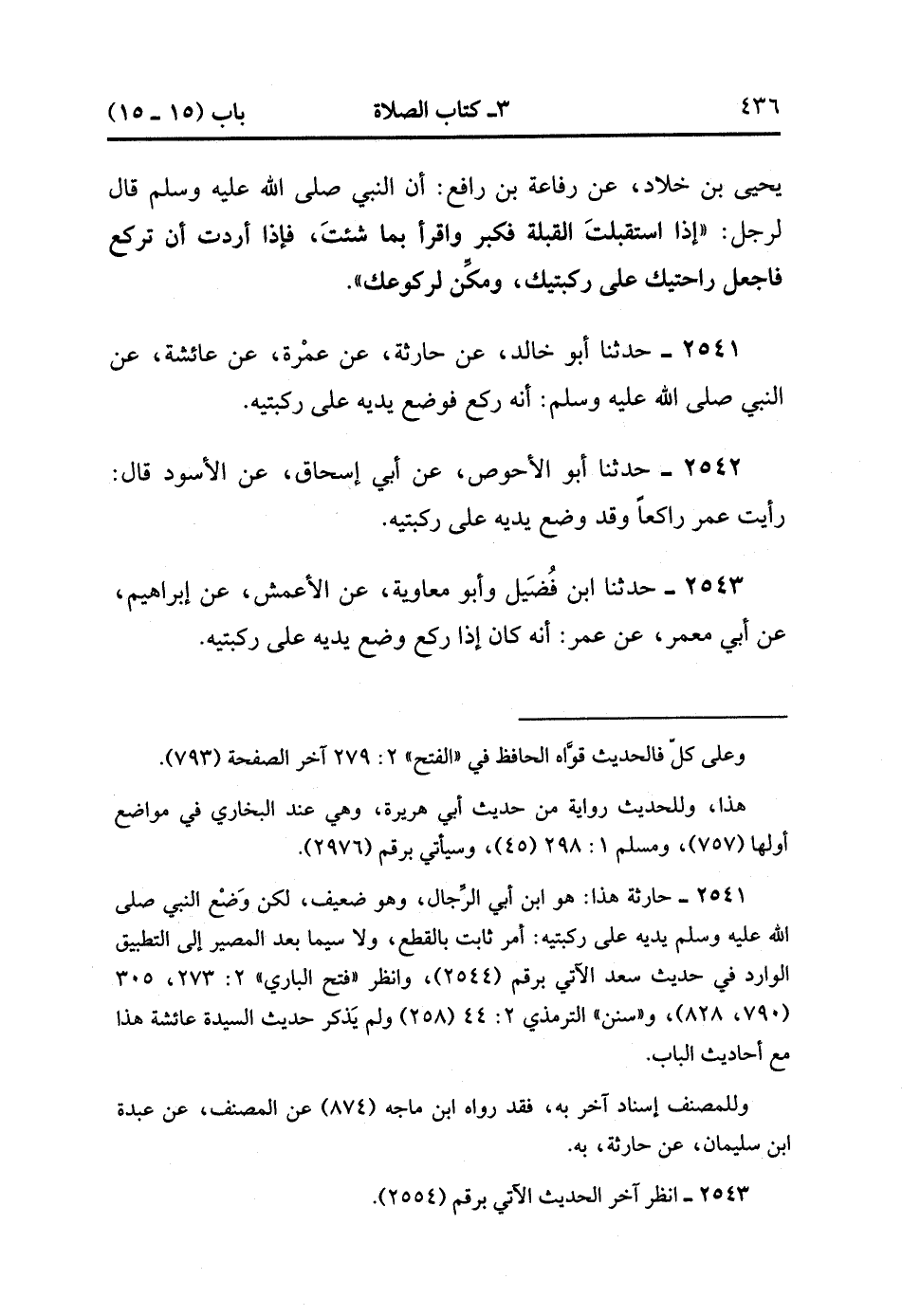 2541- حَدَّثَنَا أَبُو خَالِدٍ ، عَنْ حَارِثَةَ ، عَنْ عَمْرَةَ ، عَنْ عَائِشَةَ ، عَنِ النَّبِيِّ صَلَّى الله عَلَيْهِ وَسَلَّمَ : أَنَّهُ رَكَعَ فَوَضَعَ يَدَيْهِ عَلَى رُكْبَتَيْهِ.