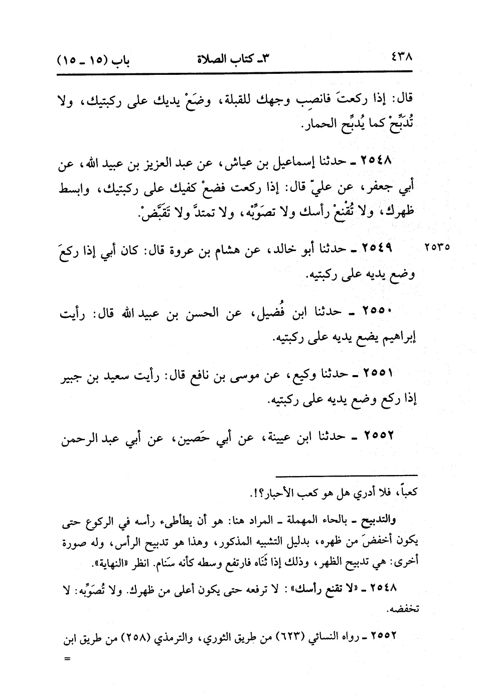 2552- حَدَّثَنَا ابْنُ عُيَيْنَةَ ، عَنْ أَبِي حَصِينٍ ، عَنْ أَبِي عَبْدِ الرَّحْمَنِ ، قَالَ : قَالَ عُمَرُ : سُنَّتْ لَكُمُ الرُّكَبُ فَأَمْسِكُوا بِالرُّكَبِ. (1/245).