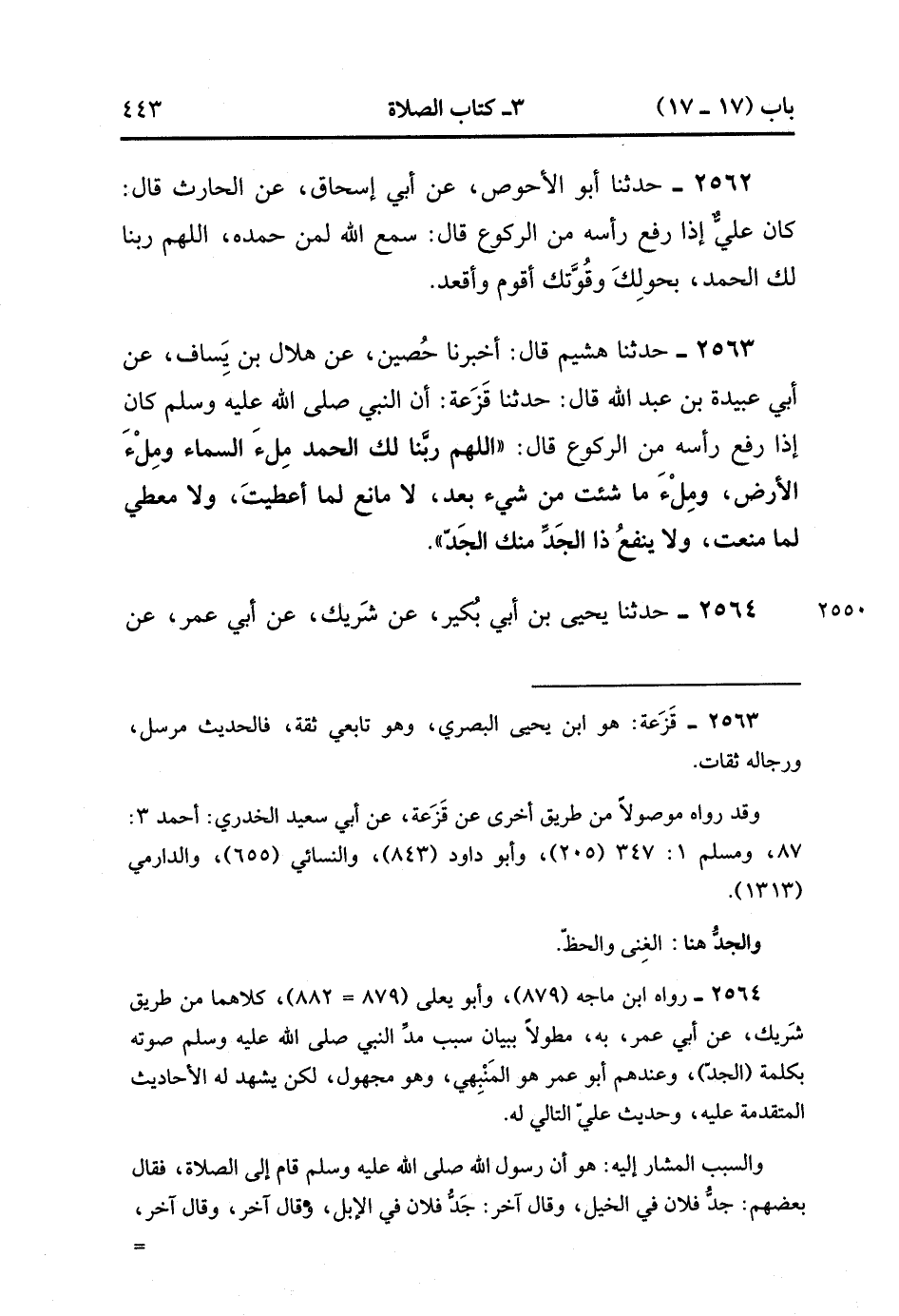2563- حَدَّثَنَا هُشَيْمٌ ، قَالَ : أَخْبَرَنَا حُصَيْنٌ ، عَنْ هِلاَلِ بْنِ يَِسَافٍ ، عَنْ أَبِي عُبَيْدَةَ بْنِ عُبَدِ اللهِ ، قَالَ : حَدَّثَنَا قَزَعَةُ ؛ أَنَّ النَّبِيَّ صَلَّى الله عَلَيْهِ وَسَلَّمَ كَانَ إذَا رَفَعَ رَأْسَهُ مِنَ الرُّكُوعِ ، قَالَ : اللَّهُمَّ رَبَّنَا لَكَ الْحَمْدُ مِلْءَ السَّمَاءِ وَمِلْءَ الأَرْضِ ، وَمِلْءَ مَا شِئْت مِنْ شَيْءٍ بَعْدُ ، لا مَانِعَ لِمَا أَعْطَيْت ، وَلا مُعْطِيَ لِمَا مَنَعْت ، وَلا يَنْفَعُ ذَا الْجَدِّ مِنْك الْجَدُّ.