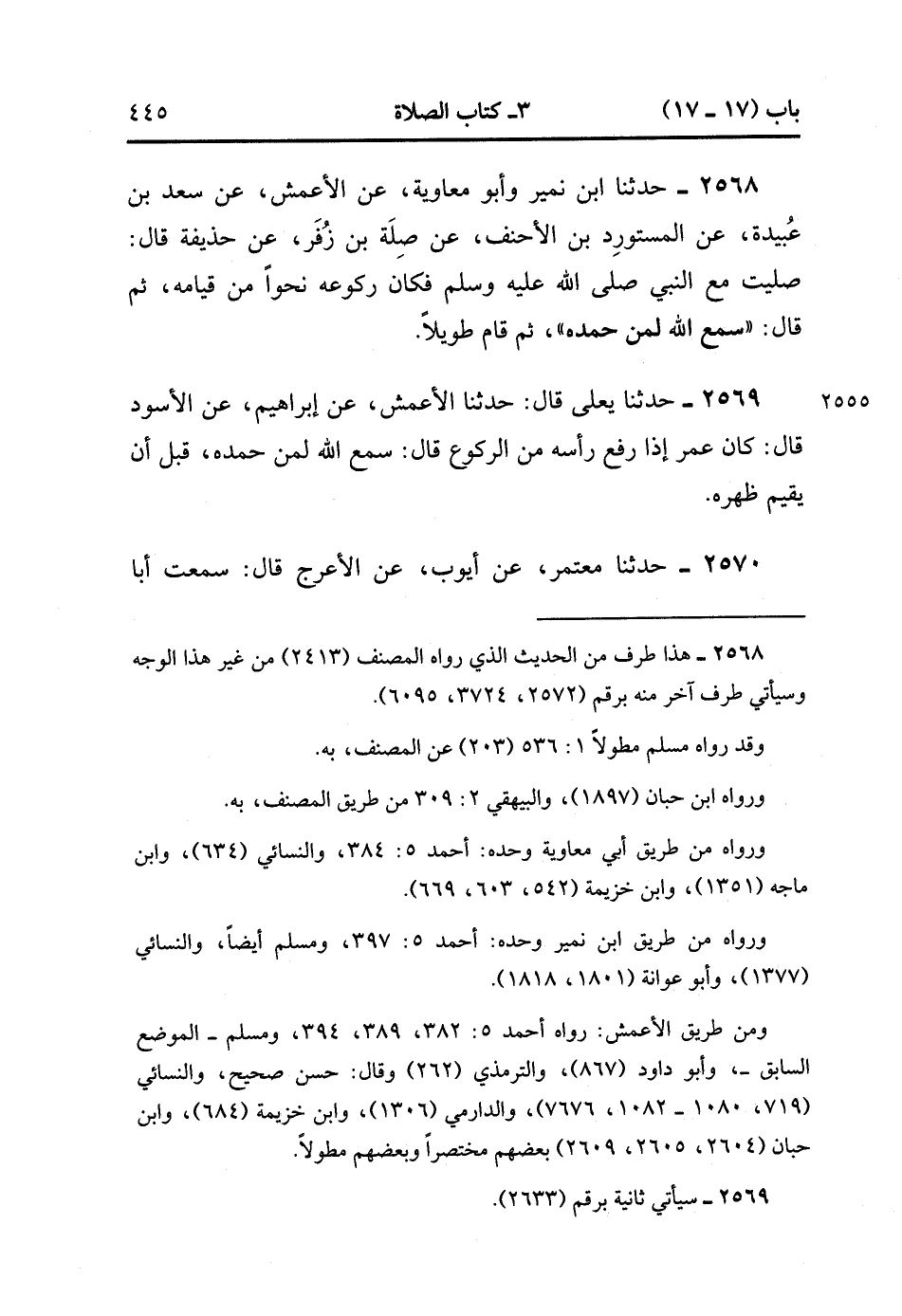 2568- حَدَّثَنَا ابْنُ نُمَيْرٍ وَأَبُو مُعَاوِيَةَ ، عَنِ الأَعْمَشِ ، عَنْ سَعْدِ بْنِ عُبَيْدَةَ ، عَنِ الْمُسْتَوْرِدِ بْنِ الأَحْنَفِ ، عَنْ صِلَةَ بْنِ زُفَرَ ، عَنْ حُذَيْفَةَ ، قَالَ : صَلَّيْتُ مَعَ النَّبِيِّ صَلَّى الله عَلَيْهِ وَسَلَّمَ فَكَانَ رُكُوعُهُ نَحْوًا مِنْ قِيَامِهِ ، ثُمَّ قَالَ : سَمِعَ اللَّهُ لِمَنْ حَمِدَهُ ، ثُمَّ قَامَ طَوِيلاً.