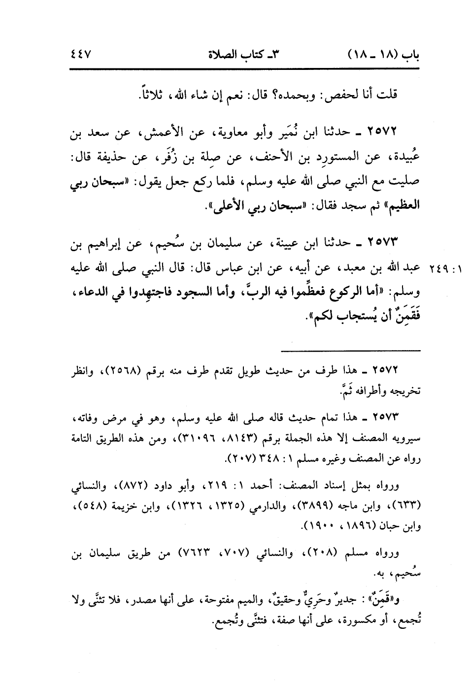 2573- حَدَّثَنَا ابْنُ عُيَيْنَةَ ، عَنْ سُلَيْمَانَ بْنِ سُحَيْمٍ ، عَنْ إبْرَاهِيمَ بْنِ عَبْدِ اللهِ بْنِ مَعْبَدٍ ، عَنْ أَبِيهِ ، عَنِ ابْنِ عَبَّاسٍ ، قَالَ : قَالَ النَّبِيُّ صَلَّى الله عَلَيْهِ وَسَلَّمَ : أَمَّا الرُّكُوعُ فَعَظِّمُوا فِيهِ الرَّبَّ ، وَأَمَّا السُّجُودُ فَاجْتَهِدُوا فِي الدُّعَاءِ ، فَقَمَِنٌ أَنْ يُسْتَجَابَ لَكُمْ. (1/248).
