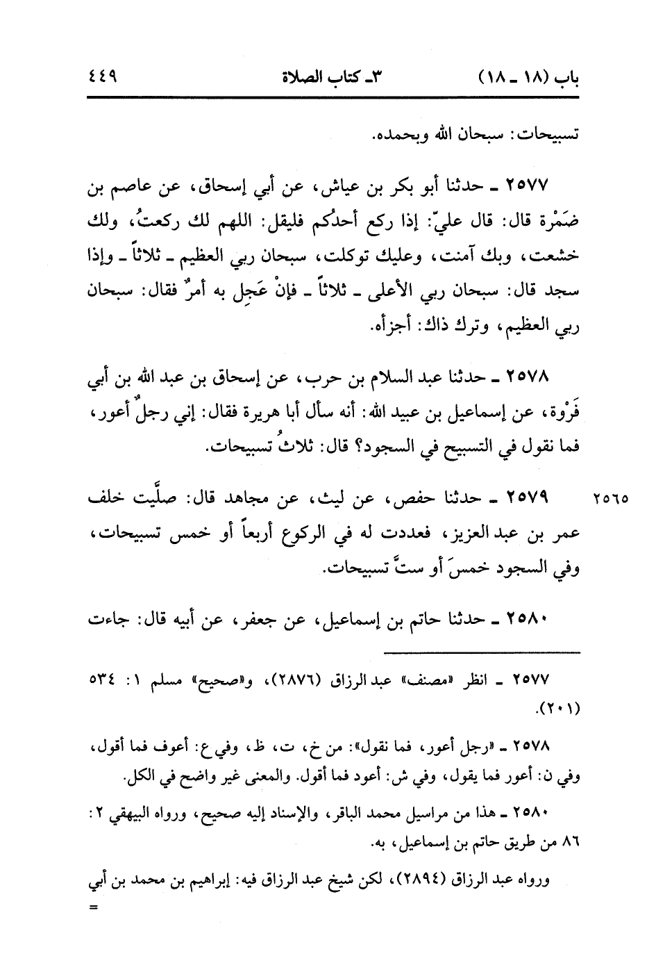 2578- حَدَّثَنَا عَبْدُ السَّلاَمِ بْنُ حرب ، عَنْ إِسْحَاقَ بْنِ عَبْدِ اللهِ بْنِ أَبِي فَرْوَةَ ، عَنْ إسْمَاعِيلَ بْنِ عُبَيْدِ اللهِ ؛ أَنَّهُ سَأَلَ أَبَا هُرَيْرَةَ ، فَقَالَ : إنِّي رَجُلٌ أَعْوَرُ ، فَمَا نَقُولُ فِي التَّسْبِيحِ فِي السُّجُودِ ؟ قَالَ : ثَلاَثُ تَسْبِيحَاتٍ.