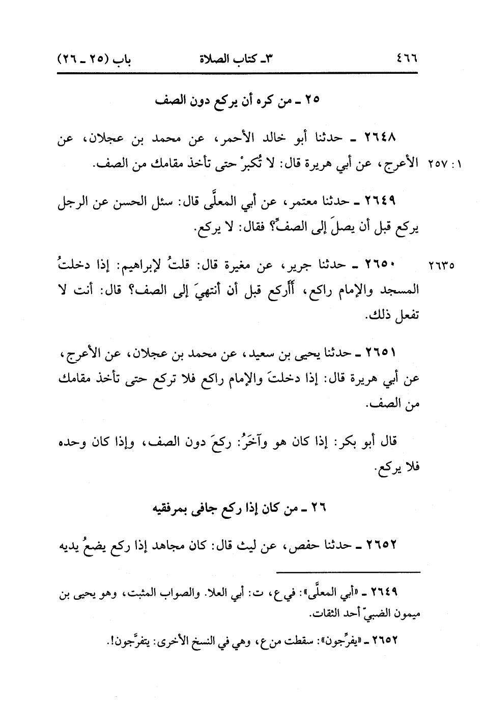 2651- حَدَّثَنَا يَحْيَى بْنُ سَعِيدٍ ، عَنْ مُحَمَّدِ بْنِ عَجْلاَنَ ، عَنِ الأَعْرَجِ ، عَنْ أَبِي هُرَيْرَةَ ، قَالَ : إذَا دَخَلْتَ وَالإِمَامُ رَاكِعٌ فَلاَ تَرْكَعْ حَتَّى تَأْخُذَ مَقَامَك مِنَ الصَّفِّ.