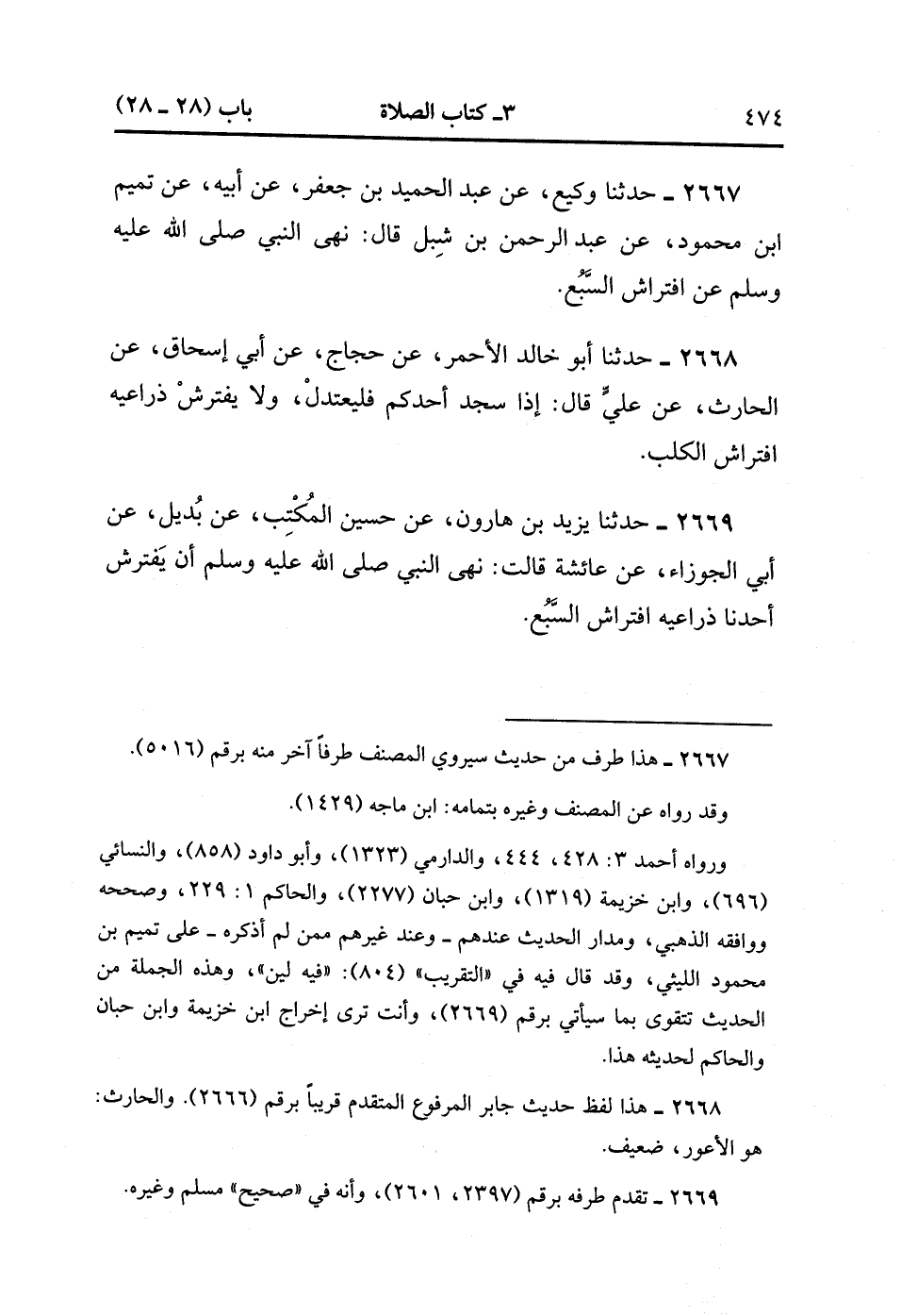 2667- حَدَّثَنَا وَكِيعٌ ، عَنْ عَبْدِ الْحَمِيدِ بْنِ جَعْفَرٍ ، عَنْ أَبِيهِ ، عَنْ تَمِيمِ بْنِ مَحْمُودٍ ، عَنْ عَبْدِ الرَّحْمَنِ بْنِ شِبْلٍ ، قَالَ : نَهَى رَسُولُ اللهِ صَلَّى الله عَلَيْهِ وَسَلَّمَ عَنِ افْتِرَاشِ السَّبُعِ.