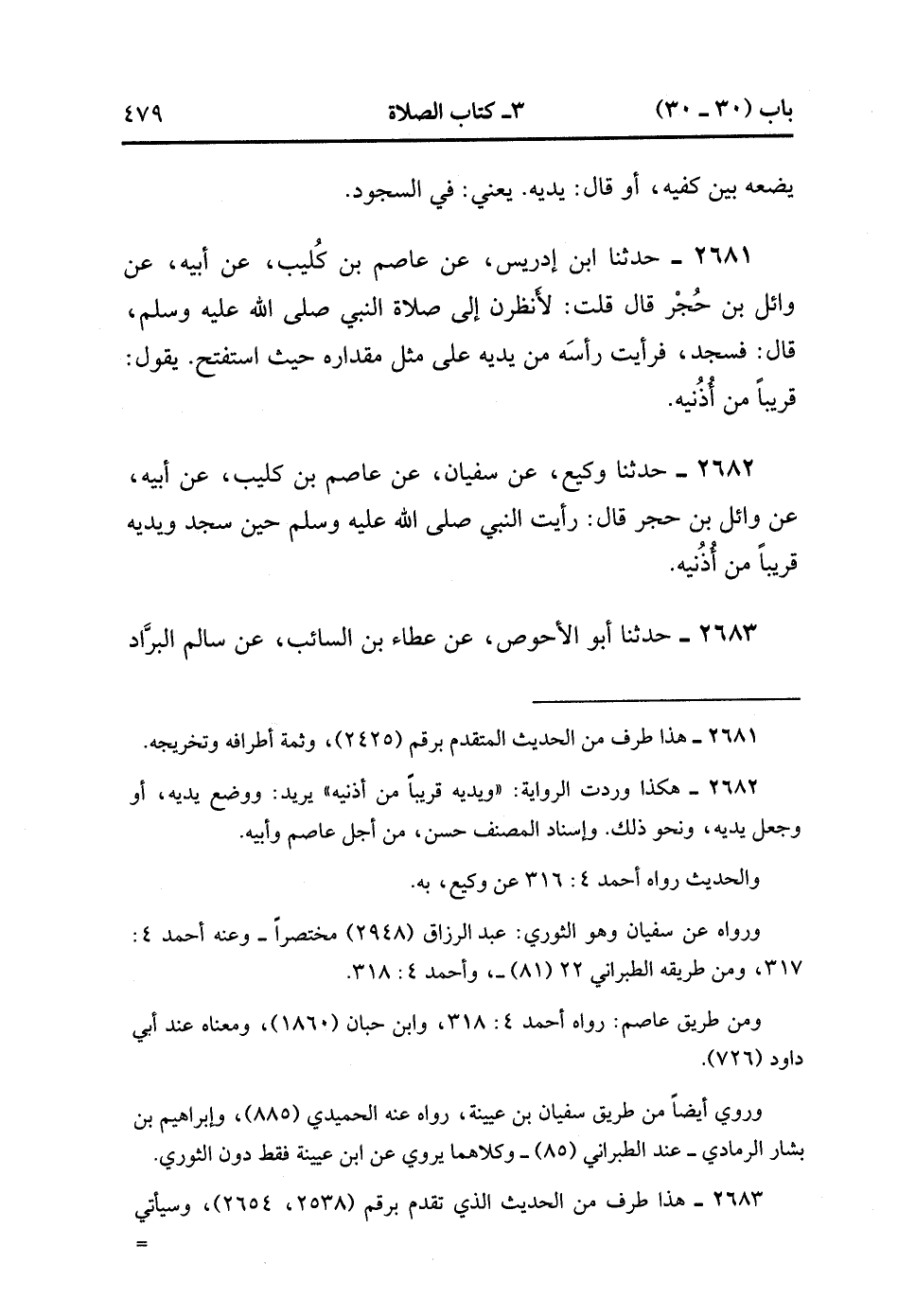 2681- حَدَّثَنَا ابْنُ إدْرِيسَ ، عَنْ عَاصِمِ بْنِ كُلَيْبٍ ، عَنْ أَبِيهِ ، عَنْ وَائِلِ بْنِ حُجْرٍ ، قَالَ : قُلْتُ : لأَنْظُرَنَّ إلَى صَلاَةِ النَّبِيِّ صَلَّى الله عَلَيْهِ وَسَلَّمَ ، قَالَ : فَسَجَدَ ، فَرَأَيْتُ رَأْسَهُ مِنْ يَدَيْهِ عَلَى مِثْلِ مِقْدَارِهِ حَيْثُ اسْتَفْتَحَ. يَقُولُ : قَرِيبًا مِنْ أُذُنَيْهِ.