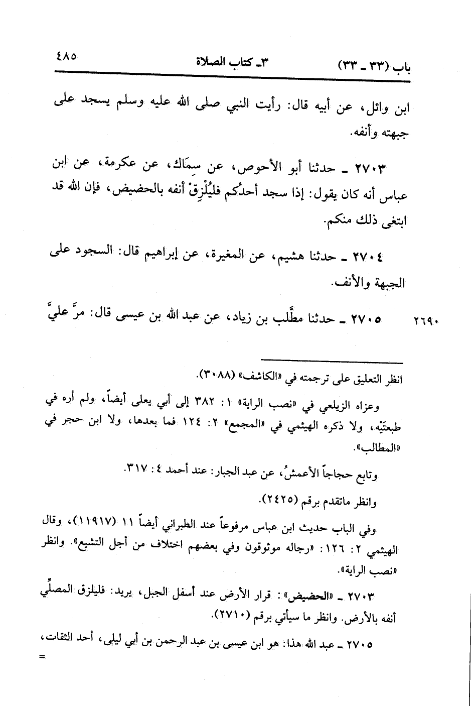 2705- حَدَّثَنَا مُطَّلِبُ بْنُ زِيَادٍ ، عَنْ عَبْدِ اللهِ بْنِ عِيسَى ، قَالَ : مَرَّ عَلَيَّ عَبْدُ الرَّحْمَنِ بْنُ أَبِي لَيْلَى وَأَنَا سَاجِدٌ ، فَقَالَ : يَا ابْنَ عِيسَى ، ضَعْ أَنْفَك لِلَّهِ. (1/262).