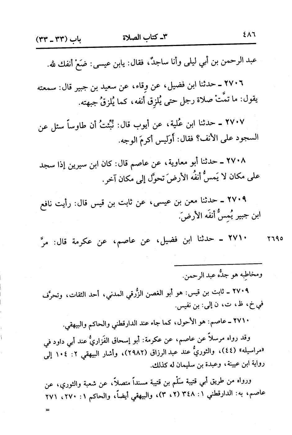 2710- حَدَّثَنَا ابْنُ فُضَيْلٍ ، عَنْ عَاصِمٍ ، عَنْ عِكْرِمَةَ ، قَالَ : مَرَّ رَسُولُ اللهِ صَلَّى الله عَلَيْهِ وَسَلَّمَ عَلَى إنْسَانٍ سَاجِدٍ لا يَضَعُ أَنْفَهُ فِي الأَرْضِ ، فَقَالَ : مَنْ صَلَّى صَلاَةً لا يُصِيبُ الأَنْفُ مَا يُصِيبُ الْجَبِينُ لَمْ تُقْبَلْ صَلاَتُهُ. (1/262).