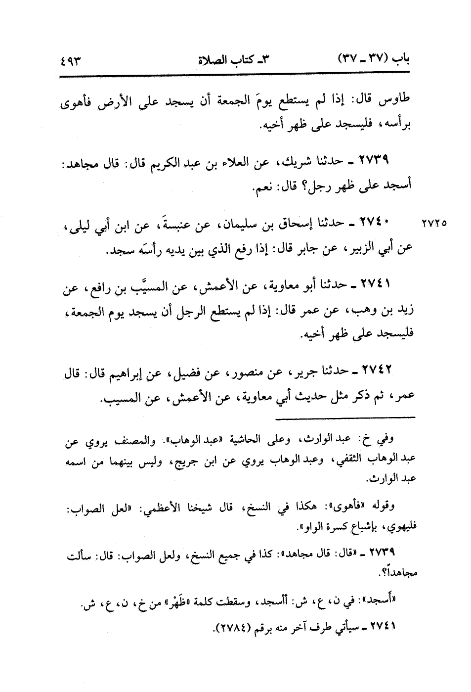 2741- حَدَّثَنَا أَبُو مُعَاوِيَةَ ، عَنِ الأَعْمَشِ ، عَنِ الْمُسَيَّبِ بْنِ رَافِعٍ ، عَنْ زَيْدِ بْنِ وَهْبٍ ، عَنْ عُمَرَ ، قَالَ : إذَا لَمْ يَسْتَطِعَ الرَّجُلُ أَنْ يَسْجُدَ يَوْمَ الْجُمُعَةِ فَلْيَسْجُدْ عَلَى ظَهْرِ أَخِيهِ.