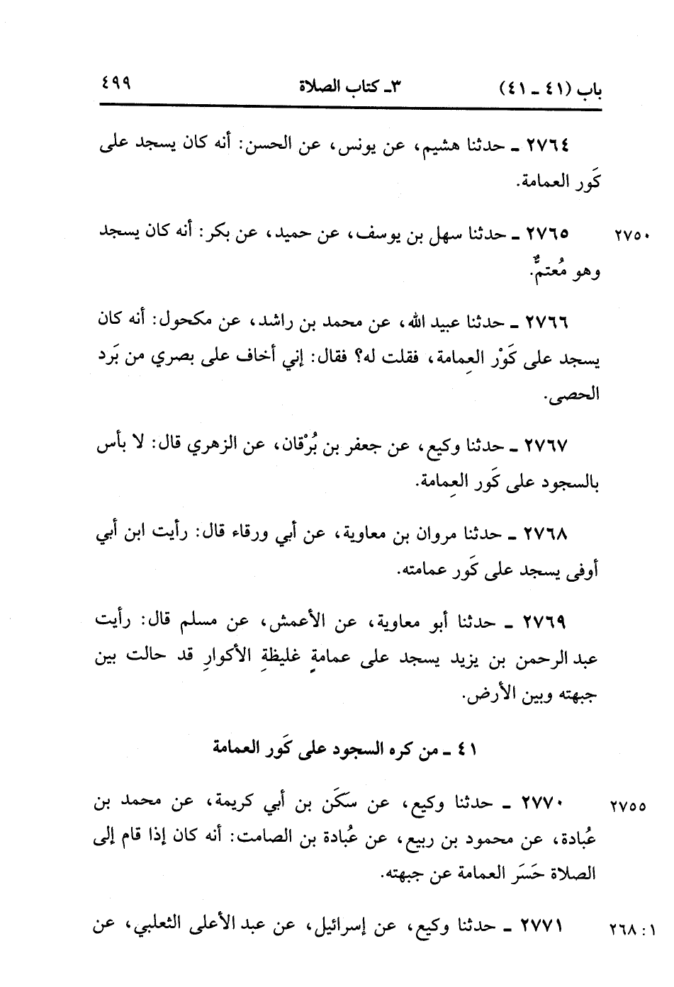2770- حَدَّثَنَا وَكِيعٌ ، عَنْ سَكَنِ بْنِ أَبِي كَرِيمَةَ ، عَنْ مُحَمَّدِ بْنِ عُبَادَةَ ، عَنْ مَحْمُودِ بْنِ رَبِيعٍ ، عَنْ عُبَادَةَ بْنِ الصَّامِتِ : أَنَّهُ كَانَ إذَا قَامَ إلَى الصَّلاَةِ حَسِرَ الْعِمَامَةَ عَنْ جَبْهَتِهِ. (1/267).