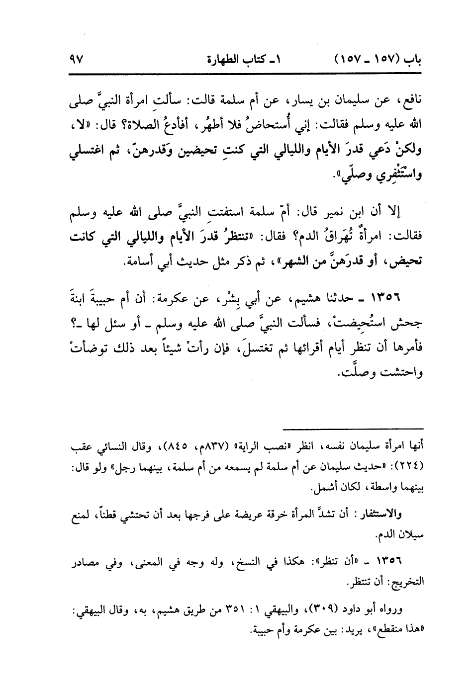 1356- حَدَّثَنَا هُشَيْمٌ ، عَنْ أَبِي بِشْرٍ ، عَنْ عِكْرِمَةَ ؛ أَنَّ أُمَّ حَبِيبَةَ ابْنَةَ جَحْشٍ اسْتُحِيضَتْ ، فَسَأَلَتِ النَّبِيَّ صَلَّى الله عَلَيْهِ وَسَلَّمَ - أَوْ سُئِلَ لَهَا ؟ - فَأَمَرَهَا أَنْ تَنْظُرَ أَيَّامَ أَقْرَائِهَا ثُمَّ تَغْتَسِلَ ، فَإِنْ رَأَتْ شَيْئًا بَعْدَ ذَلِكَ تَوَضَّأَتْ وَاحْتَشَتْ وَصَلَّتْ. (1/126).