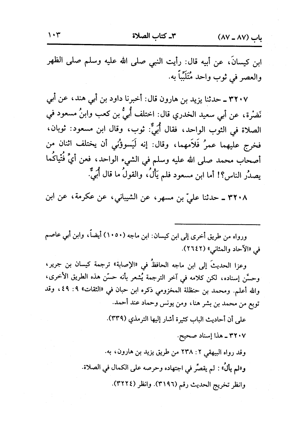 3207- حَدَّثَنَا يَزِيدُ بْنُ هَارُونَ , قَالَ : أَخْبَرَنَا دَاوُد بْنُ أَبِي هِنْدٍ ، عَنْ أَبِي نَضْرَةَ ، عَنْ أَبِي سَعِيدٍ الْخُدْرِيِّ ، قَالَ : اخْتَلَفَ أُبَيُّ بْنُ كَعْبٍ وَابْنُ مَسْعُودٍ فِي الصَّلاَةِ فِي الثَّوْبِ الْوَاحِدِ ، فَقَالَ أُبَيٌّ : ثَوْبٌ ، وَقَالَ ابْنُ مَسْعُودٍ : ثَوْبَانِ ، فَخَرَجَ عَلَيْهِمَا عُمَرُ فَلاَمَهُمَا ، وَقَالَ : إِنَّهُ لَيَسُوؤُنِي أَنْ يَخْتَلِفَ اثْنَانِ مِنْ أَصْحَابِ مُحَمَّدٍ صَلَّى الله عَلَيْهِ وَسَلَّمَ فِي الشَّيْءِ الْوَاحِدِ ، فَعَنْ أَيِّ فُتْيَاكُمَا يَصْدُر النَّاسُ ؟ أَمَّا ابْنُ مَسْعُودٍ فَلَمْ يَأْلُ ، وَالْقَوْلُ مَا قَالَ أُبَيٌّ.