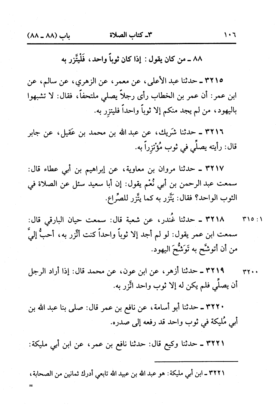 3215- حَدَّثَنَا عَبْدُ الأَعْلَى ، عَنْ مَعْمَرٍ ، عَنِ الزُّهْرِيِّ ، عَنْ سَالِمٍ ، عَنِ ابْنِ عُمَرَ : أَنَّ عُمَرَ بْنَ الْخَطَّابِ رَأَى رَجُلاً يُصَلِّي مُلْتَحِفًا ، فَقَالَ : لا تَشَبَّهُوا بِالْيَهُودِ ، مَنْ لَمْ يَجِدْ مِنْكُمْ إِلاَّ ثَوْبًا وَاحِدًا فَلْيَتَّزِرْ بِهِ.