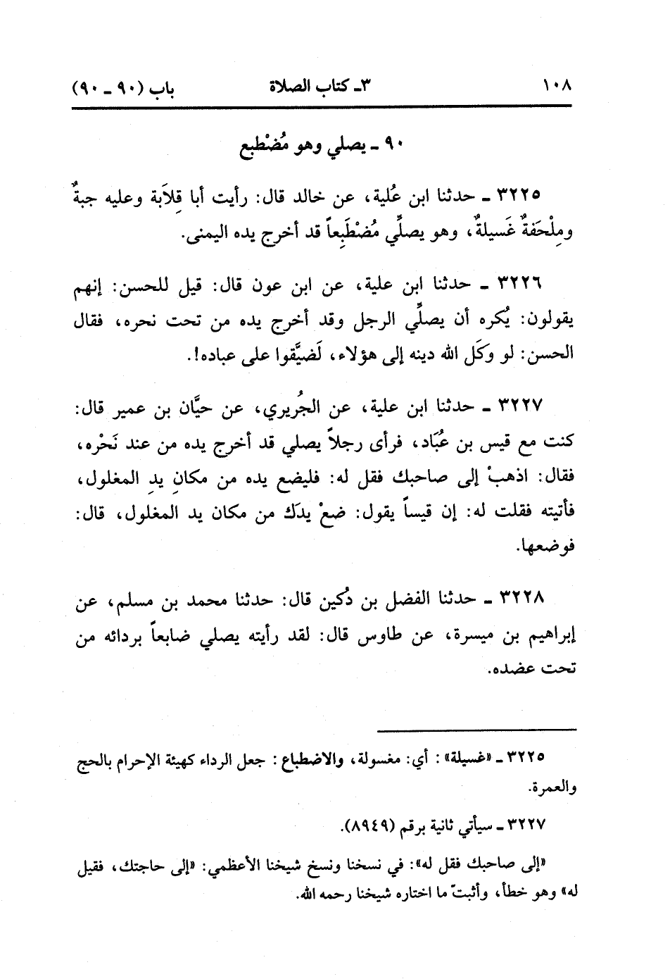 3228- حَدَّثَنَا الْفَضْلُ بْنُ دُكَيْنٍ , قَالَ : حدَّثَنَا مُحَمَّدُ بْنُ مُسْلِمٍ ، عَنْ إبْرَاهِيمَ بْنِ مَيْسَرَةَ ، عَنْ طَاوُوسٍ ، قَالَ : لَقَدْ رَأَيْتُهُ يُصَلِّي ضَابِعًا بِرِدَائِهِ مِنْ تَحْتِ عَضُدِهِ. (1/315).