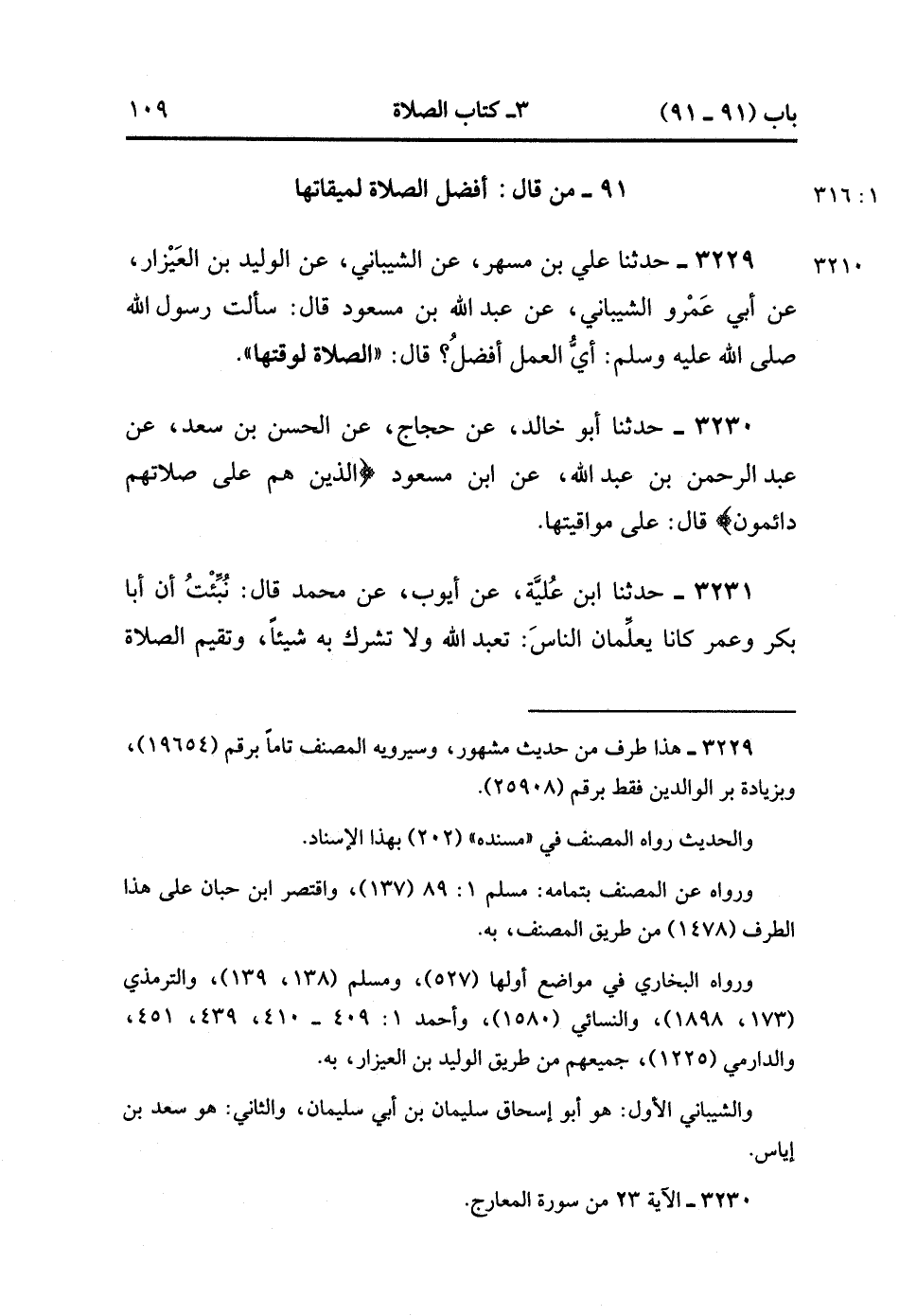 3229- حَدَّثَنَا عَلِيُّ بْنُ مُسْهِرٍ ، عَنِ الشَّيْبَانِيِّ ، عَنِ الْوَلِيدِ بْنِ الْعَيْزَارِ ، عَنْ أَبِي عَمْرٍو الشَّيْبَانِيِّ ، عَنْ عَبْدِ اللهِ بْنِ مَسْعُودٍ ، قَالَ : سَأَلْتُ رَسُولَ اللهِ صَلَّى الله عَلَيْهِ وَسَلَّمَ أَيُّ الْعَمَلِ أَفْضَلُ ؟ قَالَ : الصَّلاَةُ لِوَقْتِهَا.