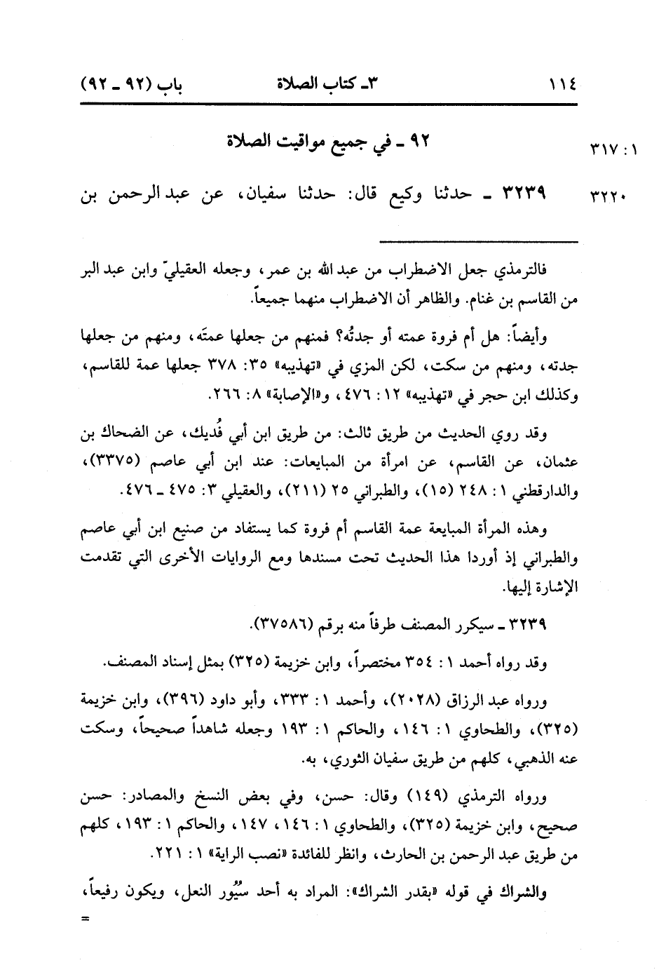3239- حَدَّثَنَا وَكِيعٌ , قَالَ : حدَّثَنَا سُفْيَانُ ، عَنْ عَبْدِ الرَّحْمَنِ بْنِ الْحَارِثِ بْنِ عَيَّاشِ بْنِ أَبِي رَبِيعَةَ ، عَنْ حَكِيمِ بْنِ حَكِيمِ بْنِ عَبَّادِ بْنِ حُنَيْفٍ ، عَنْ نَافِعِ بْنِ جُبَيْرِ بْنِ مُطْعِمٍ ، عَنِ ابْنِ عَبَّاسٍ ، قَالَ : قَالَ رَسُولُ اللهِ صَلَّى الله عَلَيْهِ وَسَلَّمَ : أَمَّنِي جِبْرِيلُ عِنْدَ الْبَيْتِ مَرَّتَيْنِ ، فَصَلَّى بِي الظُّهْرَ حِينَ زَالَتِ الشَّمْسُ وَكَانَتْ بِقَدْرِ الشِّرَاكِ ، وَصَلَّى بِي الْعَصْرَ حِينَ كَانَ ظِلَّ كُلِّ شَيْءٍ مِثْلَهُ ، وَصَلَّى بِي الْمَغْرِبَ حِينَ أَفْطَرَ الصَّائِمُ ، وَصَلَّى بِي الْعِشَاءَ حِينَ غَابَ الشَّفَقُ ، وَصَلَّى بِي الْفَجْرَ حِينَ حَرُمَ الطَّعَامُ وَالشَّرَابُ عَلَى الصَّائِمِ ، وَصَلَّى بِي الْغدَ الظُّهْرَ حِينَ كَانَ ظِلَّ كُلِّ شَيْءٍ مِثْلَهُ ، وَصَلَّى بِي الْعَصْرَ حِينَ كَانَ ظِلَّ كُلِّ شَيْءٍ مِثْلَيْهِ ، وَصَلَّى بِي الْمَغْرِبَ حِينَ أَفْطَرَ الصَّائِمُ ، وَصَلَّى بِي الْعِشَاءَ ثُلُثَ اللَّيْلِ ، وَصَلَّى بِي الْفَجْرَ فَأَسْفَرَ ، ثُمَّ الْتَفَتَ إلَيَّ ، فَقَالَ : يَا مُحَمَّدُ ، هَذَا الْوَقْتُ وَقْتُ النَّبِيِّينَ قَبْلَك ، الْوَقْتُ مَا بَيْنَ هَذَيْنِ الْوَقْتَيْنِ. (1/317).