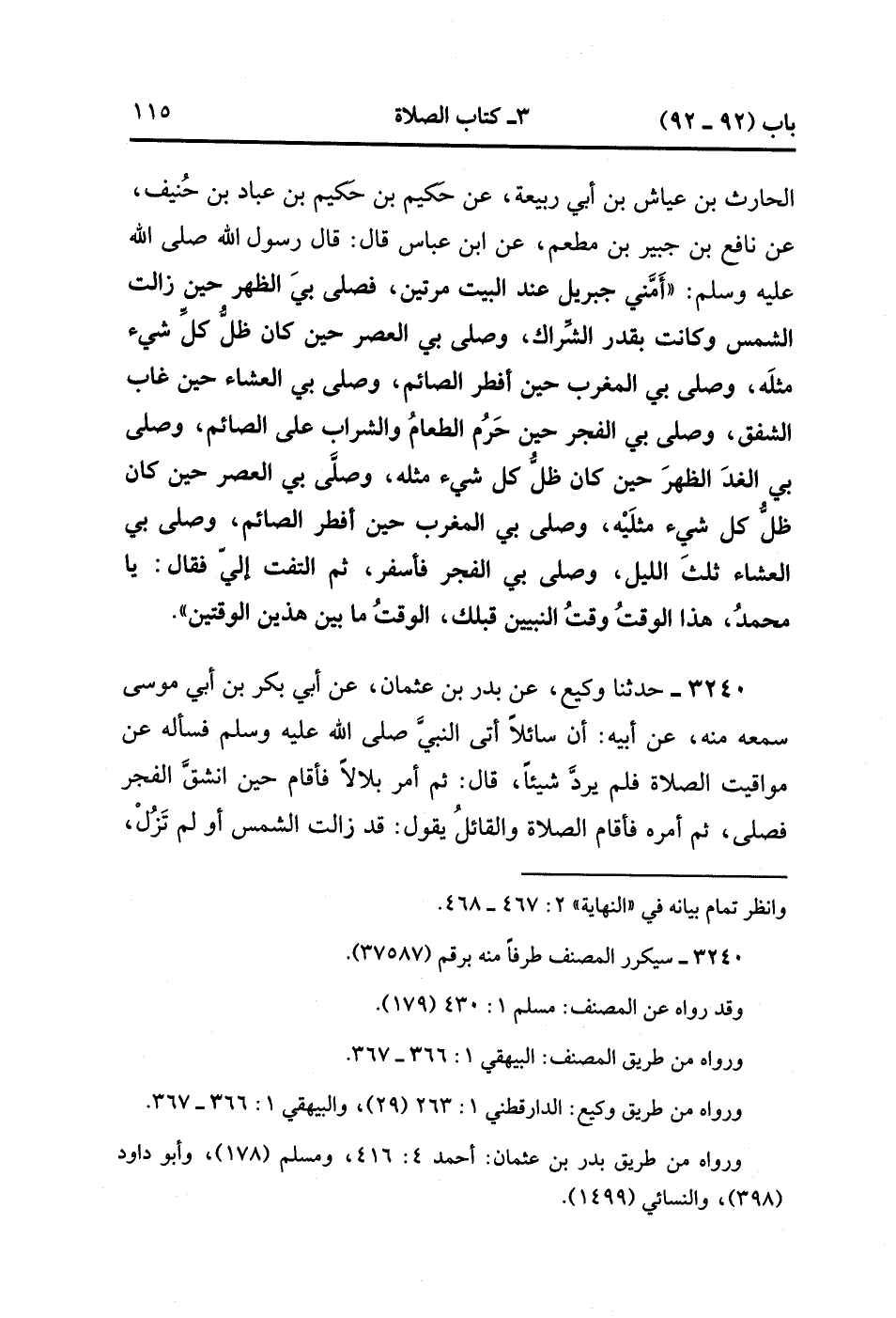 3240- حَدَّثَنَا وَكِيعٌ ، عَنْ بَدْرِ بْنِ عُثْمَانَ ، عَنْ أَبِي بَكْرِ بْنِ أَبِي مُوسَى سَمِعَهُ مِنْهُ عَنْ أَبِيهِ : أَنَّ سَائِلاً أَتَى النَّبِيَّ صَلَّى الله عَلَيْهِ وَسَلَّمَ فَسَأَلَهُ عَنْ مَوَاقِيتِ الصَّلاَةِ فَلَمْ يَرُدَّ شَيْئًا ، قَالَ : ثُمَّ أَمَرَ بِلاَلاً فَأَقَامَ حِينَ انْشَقَّ الْفَجْرُ فَصَلَّى ، ثُمَّ أَمَرَهُ فَأَقَامَ الصَّلاَةَ وَالْقَائِلُ يَقُولُ : قَدْ زَالَتِ الشَّمْسُ ، أَوْ لَمْ تَزُلْ ، وَهُوَ كَانَ أَعْلَمَ مِنْهُمْ ، ثُمَّ أَمَرَهُ فَأَقَامَ الْعَصْرَ وَالشَّمْسُ مُرْتَفِعَةٌ ، وَأَمَرَهُ فَأَقَامَ الْمَغْرِبَ حِينَ وَقَعَتِ الشَّمْسُ ، وَأَمَرَهُ فَأَقَامَ الْعِشَاءَ عِنْدَ سُقُوطِ الشَّفَقِ ، ثُمَّ صَلَّى الْفَجْرَ مِنَ الْغَدِ وَالْقَائِلُ يَقُولُ : قَدْ طَلَعَتِ الشَّمْسُ ، أَوْ لَمْ تَطْلُعْ ، وَهُوَ كَانَ أَعْلَمَ مِنْهُمْ ، وَصَلَّى الظُّهْرَ قَرِيبًا مِنْ وَقْتِ الْعَصْرِ بِالأَمْسِ ، وَصَلَّى الْعَصْرَ وَالْقَائِلُ يَقُولُ : قَدَ احْمَرَّتِ الشَّمْسُ ، وَصَلَّى الْمَغْرِبَ قَبْلَ أَنْ يَغِيبَ الشَّفَقُ ، وَصَلَّى الْعِشَاءَ ثُلُثَ اللَّيْلِ الأَوَّلَ ، ثُمَّ قَالَ : أَيْنَ السَّائِلُ عَنِ الْوَقْتِ ؟ مَا بَيْنَ هَذَيْنِ الْوَقْتَيْنِ وَقْتٌ. (1/317).