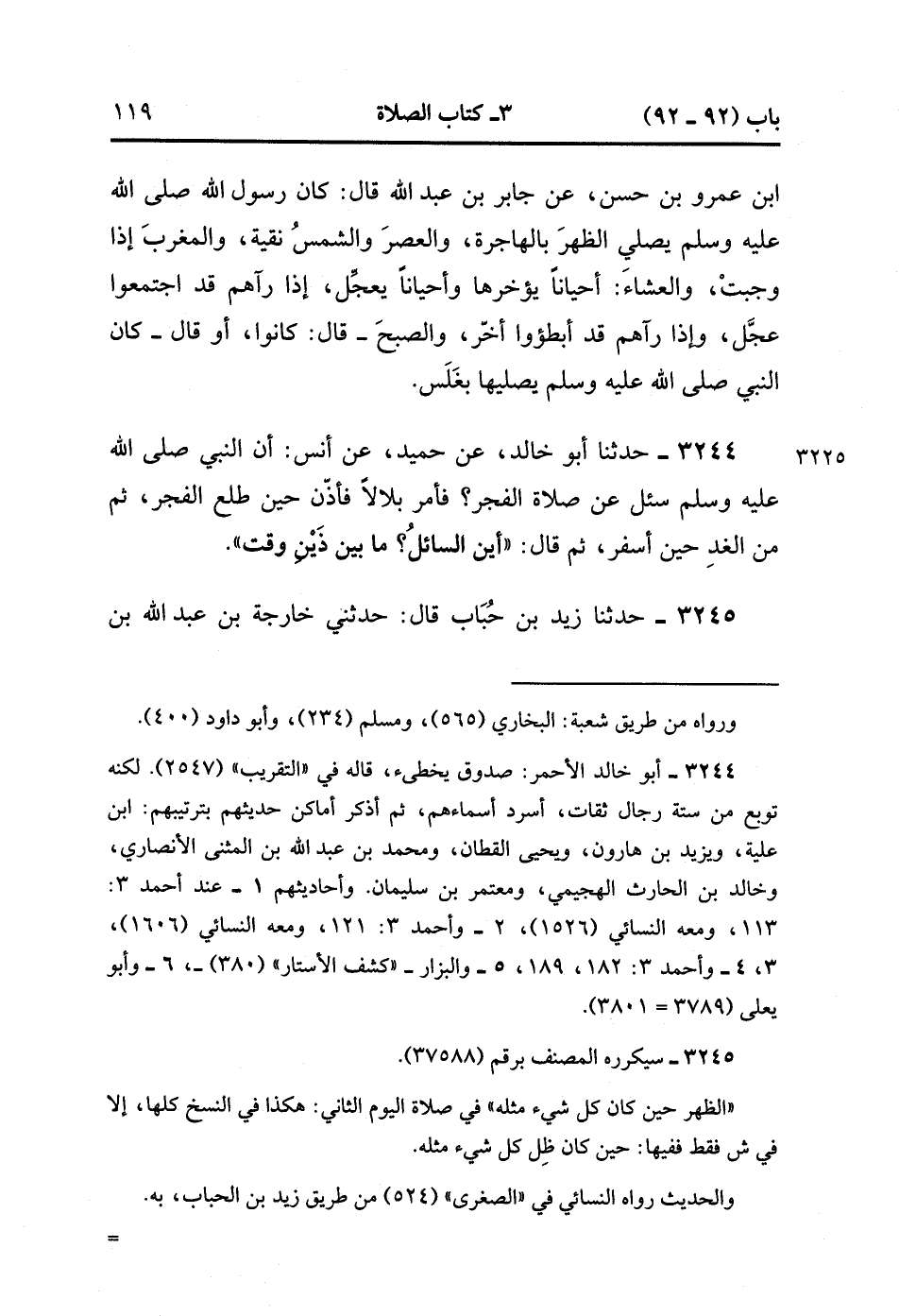 3244- حَدَّثَنَا أَبُو خَالِدٍ ، عَنْ حُمَيْدٍ ، عَنْ أَنَسٍ : أَنَّ النَّبِيَّ صَلَّى الله عَلَيْهِ وَسَلَّمَ سُئِلَ عَنْ صَلاَةِ الْفَجْرِ ؟ فَأَمَرَ بِلاَلاً فَأَذَّنَ حِينَ طَلَعَ الْفَجْرُ ، ثُمَّ مِنَ الْغَدِ حِينَ أَسْفَرَ ، ثُمَّ قَالَ : أَيْنَ السَّائِلُ ؟ مَا بَيْنَ ذَيْنِ وَقْتٌ. (1/318).