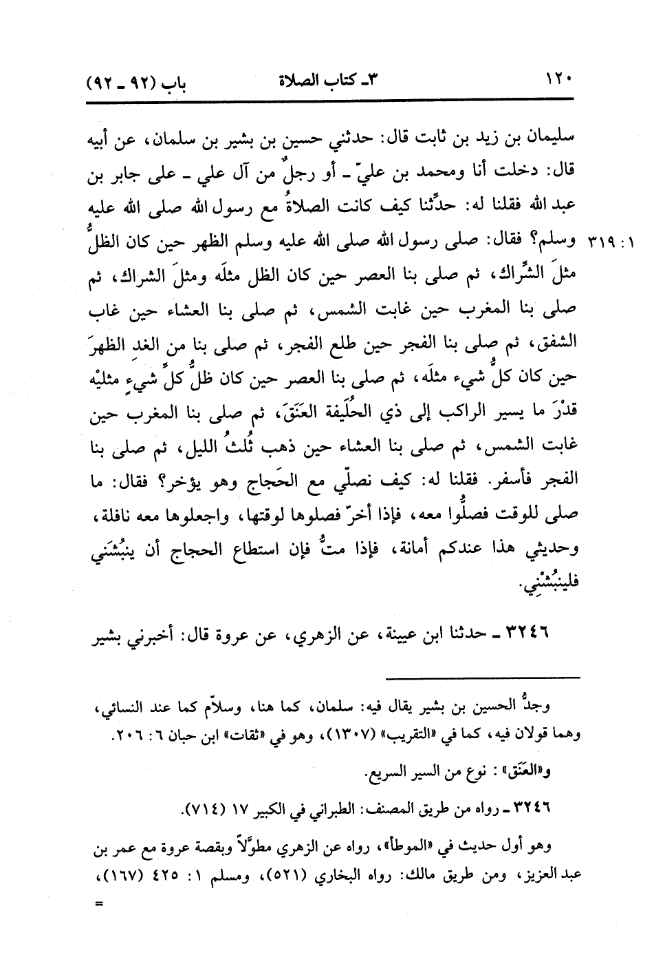 3245- حَدَّثَنَا زَيْدُ بْنُ حُبَابٍ ، قَالَ : حدَّثَنِي خَارِجَةُ بْنُ عَبْدِ اللهِ بْنِ سُلَيْمَانَ بْنِ زَيْدِ بْنِ ثَابِتٍ ، قَالَ : حَدَّثَنِي حُسَيْنُ بْنُ بَشِير بْنُ سَلْمَانَ ، عَنْ أَبِيهِ ، قَالَ : دَخَلْت أَنَا وَمُحَمَّدُ بْنُ عَلِيٍّ - أَوْ رَجُلٌ مِنْ آلِ عَلِيٍّ - عَلَى جَابِرِ بْنِ عَبْدِ اللهِ فَقُلْنَا لَهُ : حَدِّثْنَا كَيْفَ كَانَتِ الصَّلاَةُ مَعَ رَسُولِ اللهِ صَلَّى الله عَلَيْهِ وَسَلَّمَ ؟ فَقَالَ : صَلَّى رَسُولُ اللهِ صَلَّى الله عَلَيْهِ وَسَلَّمَ الظُّهْرَ حِينَ كَانَ الظِّلُّ مِثْلَ الشِّرَاكِ ، ثُمَّ صَلَّى بِنَا الْعَصْرَ حِينَ كَانَ الظِّلُّ مِثْلَهُ وَمِثْلَ الشِّرَاكِ ، ثُمَّ صَلَّى بِنَا الْمَغْرِبَ حِينَ غَابَتِ الشَّمْسُ ، ثُمَّ صَلَّى بِنَا الْعِشَاءَ حِينَ غَابَ الشَّفَقُ ، ثُمَّ صَلَّى بِنَا الْفَجْرَ حِينَ طَلَعَ الْفَجْرُ ، ثُمَّ صَلَّى بِنَا مِنَ الْغَدِ الظُّهْرَ حِينَ كَانَ ((ظِلُّ)) كُلِّ شَيْءٍ مِثْلَهُ ، ثُمَّ صَلَّى بِنَا الْعَصْرَ حِينَ كَانَ ظِلُّ كُلِّ شَيْءٍ مِثْلَيْهِ قَدْرَ مَا يَسِيرُ الرَّاكِبُ إلَى ذِي الْحُلَيْفَةِ الْعَنَقِ ، ثُمَّ صَلَّى بِنَا الْمَغْرِبَ حِينَ غَابَتِ الشَّمْسُ ، ثُمَّ صَلَّى بِنَا الْعِشَاءَ حِينَ ذَهَبَ ثُلُثُ اللَّيْلِ ، ثُمَّ صَلَّى بِنَا الْفَجْرَ فَأَسْفَرَ. فَقُلْنَا لَهُ : كَيْفَ نُصَلِّي مَعَ الْحَجَّاجِ وَهُوَ يُؤَخِّرُ ؟ فَقَالَ : مَا صَلَّى لِلْوَقْتِ فَصَلُّوا مَعَهُ ، فَإِذَا أَخَّرَ فَصَلُّوهَا لِوَقْتِهَا ، وَاجْعَلُوهَا مَعَهُ نَافِلَةً ، وَحَدِيثِي هَذَا عِنْدَكُمْ أَمَانَةٌ فَإِذَا مِتُّ ، فَإِن اسْتَطَاعَ الْحَجَّاجُ أَنْ يَنْبُشَنِي فَلْيَنْبُشْنِي. (1/318)