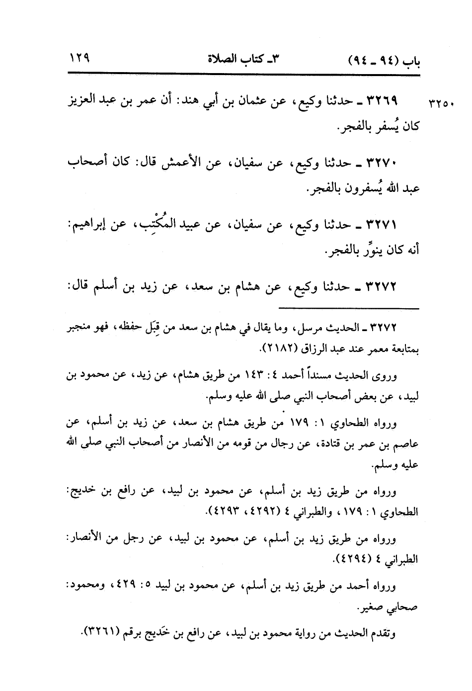 3272- حَدَّثَنَا وَكِيعٌ ، عَنْ هِشَامِ بْنِ سَعْدٍ ، عَنْ زَيْدِ بْنِ أَسْلَمَ ، قَالَ : قَالَ رَسُولُ اللهِ صَلَّى الله عَلَيْهِ وَسَلَّمَ : أَسْفِرُوا بِالْفَجْرِ ، فَإِنَّكُمْ كُلَّمَا أَسْفَرْتُمْ كَانَ أَعْظَمَ لِلأَجْرِ. (1/321).