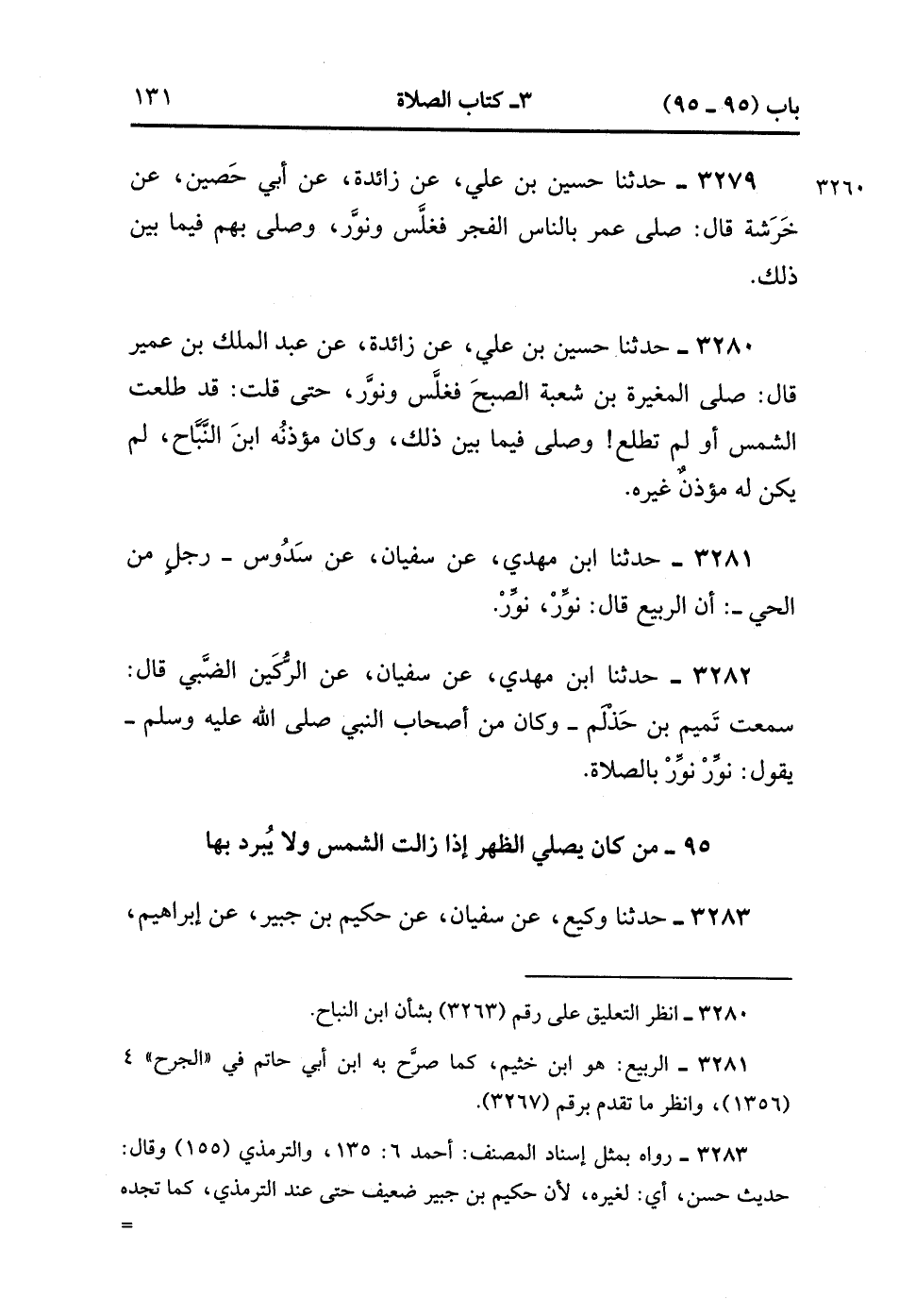 3282- حَدَّثَنَا ابْنُ مَهْدِيٍّ ، عَنْ سُفْيَانَ ، عَنِ الرُّكَيْنِ الضَّبِّيِّ ، قَالَ : سَمِعْتُ تَمِيمَ بْنَ حَذْلَمَ - وَكَانَ مِنْ أَصْحَابِ النَّبِيِّ صَلَّى الله عَلَيْهِ وَسَلَّمَ - يَقُولُ : نَوِّرْ ، نَوِّرْ بِالصَّلاَةِ.