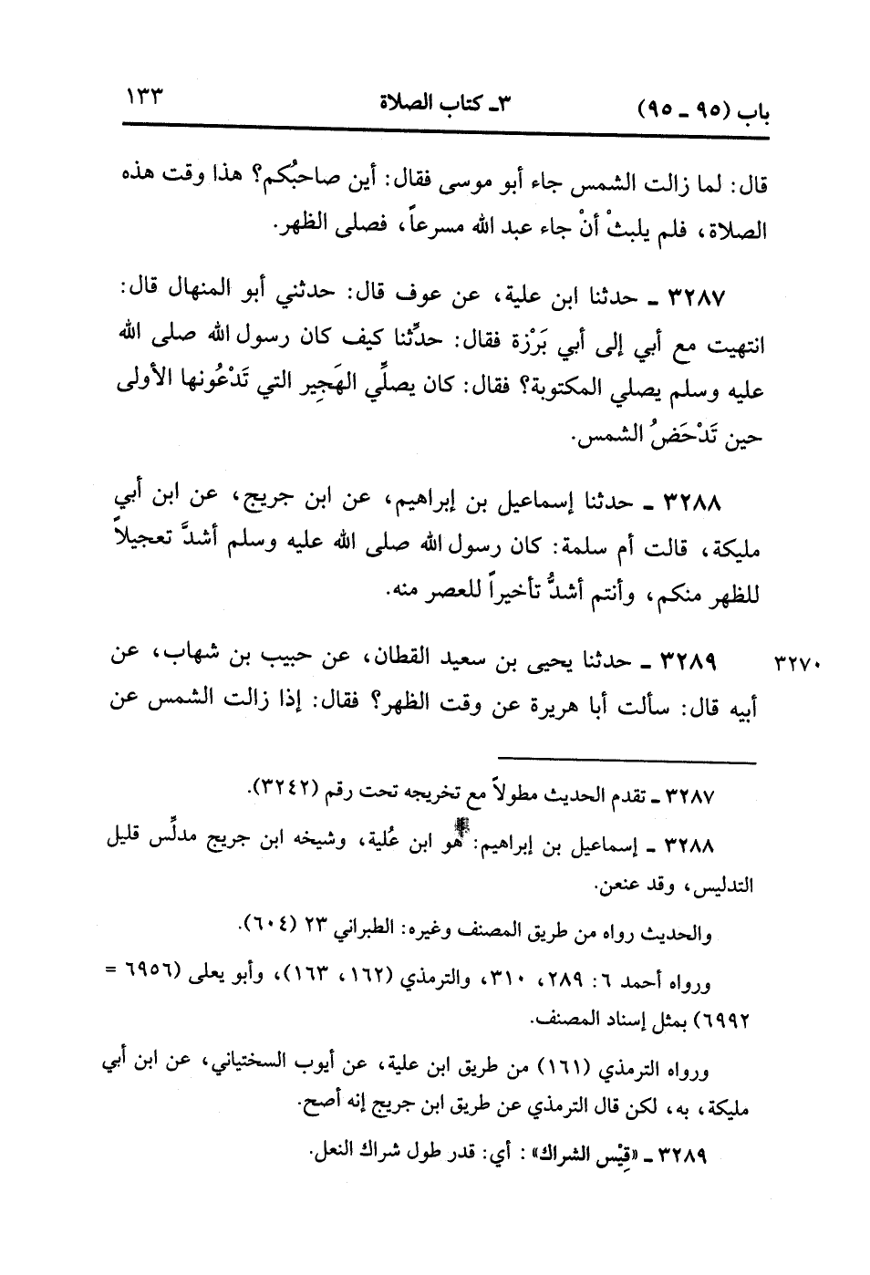 3289- حَدَّثَنَا يَحْيَى بْنُ سَعِيدٍ الْقَطَّانُ ، عَنْ حَبِيبِ بْنِ شِهَابٍ ، عَنْ أَبِيهِ ، قَالَ : سَأَلْتُ أَبَا هُرَيْرَةَ عَنْ وَقْتِ الظُّهْرِ ؟ فَقَالَ : إذَا زَالَتِ الشَّمْسُ عَنْ نِصْفِ النَّهَارِ ، وَكَانَ الظِّلُّ قِيسَ الشِّرَاكِ فَقَدْ قَامَتِ الظُّهْرُ. (1/323).