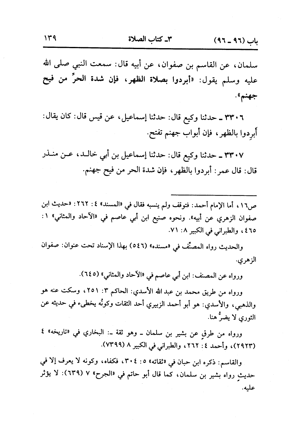 3307- حَدَّثَنَا وَكِيعٌ , قَالَ : حدَّثَنَا إسْمَاعِيلُ بْنُ أَبِي خَالِدٍ ، عَنْ مُنْذِرٍ ، قَالَ : قَالَ عُمَرُ : أَبْرِدُوا بِالظُّهْرِ ، فَإِنَّ شِدَّةَ الْحَرِّ مِنْ فَيْحِ جَهَنَّمَ. (1/325).